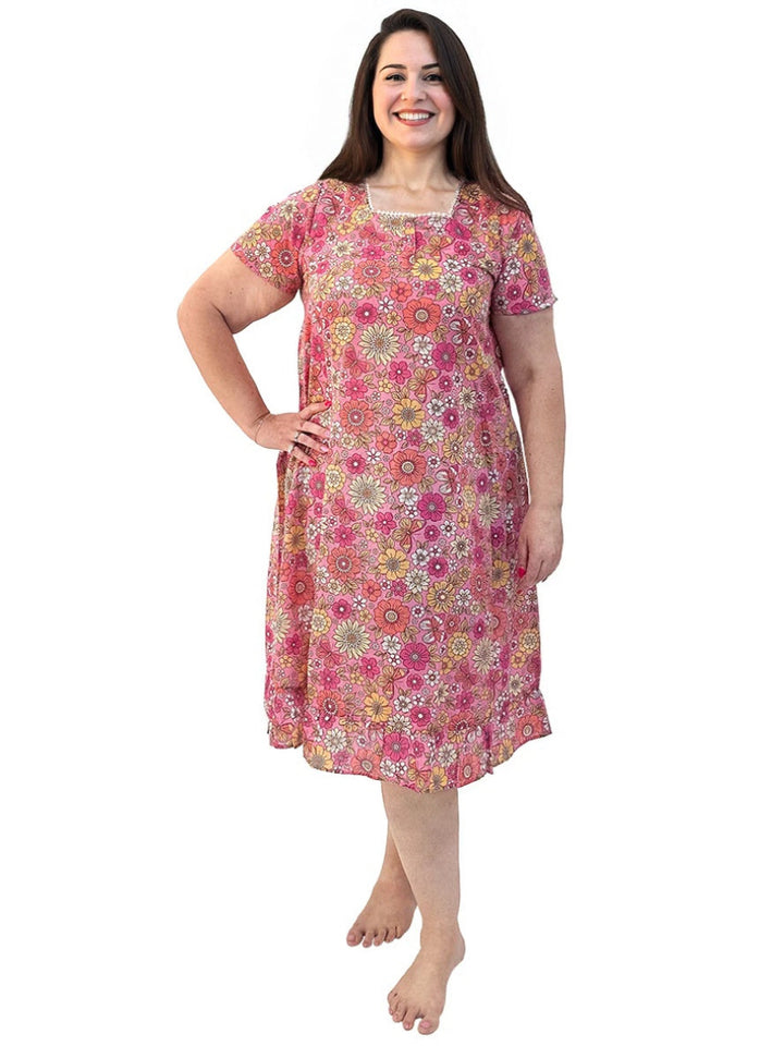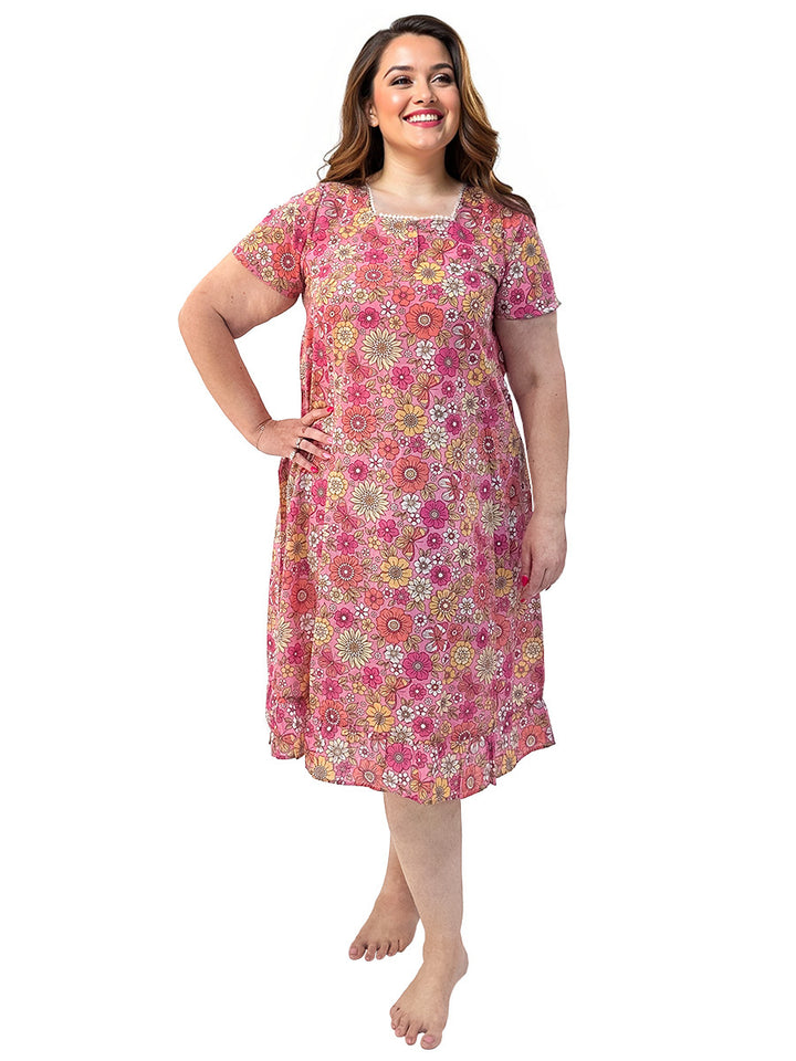 Lovely and lightweight, everyone’s favourite printed cotton nighties are back. Available in 3 beautiful floral prints, these comfy short sleeve, women’s plus size nighties are soft, light and breathable to wear, with pretty, lace trim at the hem and a frill at the hem.