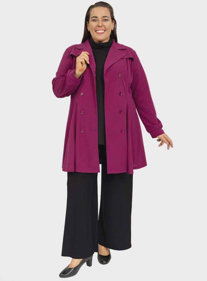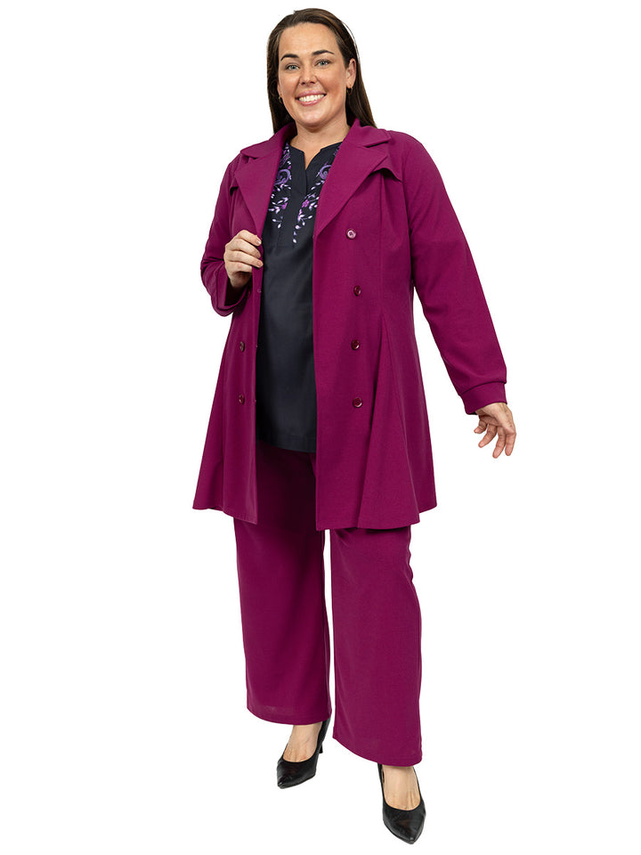 This stunning double breasted, swing jacket is an elegant addition to your wardrobe. Available in Blue and Wine, it features long sleeves and stand collar and a classy, double breasted look. With a smart, tailored cut and gored at the hem, for extra swing, it’s a fabulous look that will dress up any outfit. Team it with the matching pants to finish the look.