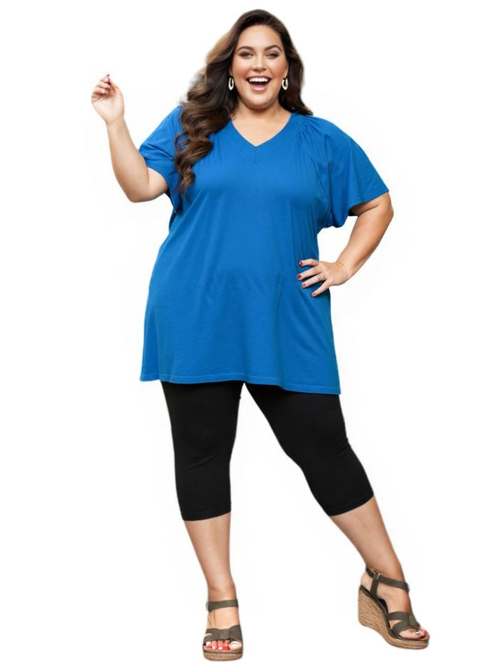 Comfortable, lightweight, cotton rich, plus size top that’s perfect for summer. With striking v-neck with short, raglan sleeves, gathered at the shoulder for a comfortable fit, dress it up with pants or a skirt, or dress it down with capris or leggings. Available in three fabulous plain colours and two prints these smart tops are must.