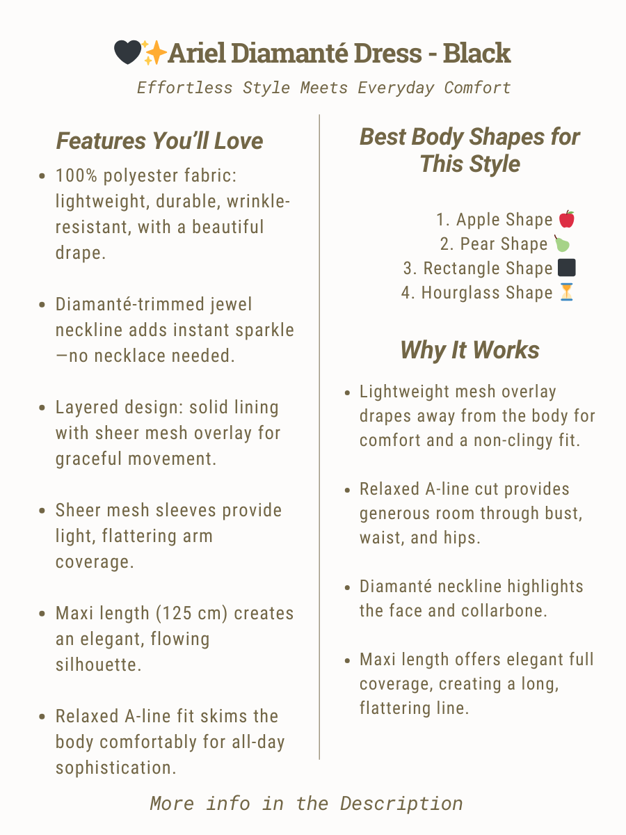 Make a stunning entrance with this elegant black maxi dress, perfect for special occasions. Crafted from 100% flowing polyester, this dress features a comfortable inner lining and a delicate sheer mesh overlay that creates a graceful, ethereal drape. The sparkling diamanté-trimmed neckline offers built-in glamour, while the flattering, sheer mesh sleeves provide elegant coverage. This dress is designed to offer both sophistication and all-day comfort.