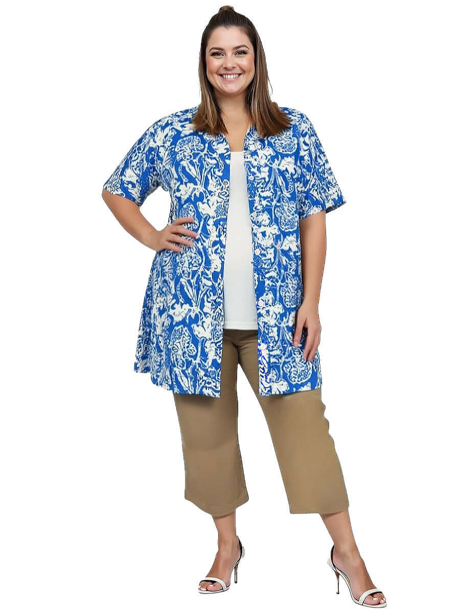 The classic collared neckline and full button-down front make it the ultimate wardrobe multitasker — wear it closed for a polished look, or open over a cami or tank for a more relaxed, layered style. At 90cm in length, this blouse sits at a flattering tunic length, giving you extra coverage that pairs perfectly with pants, shorts, or capris.