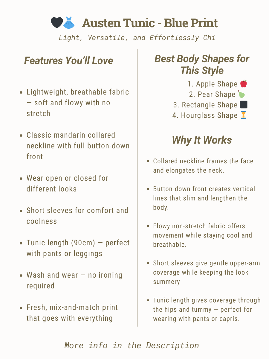 Perfect for women who carry fullness around the midsection. The structured collar and vertical button-down front create a long, lean line through the torso. The flowy, non-cling fabric skims gently over the tummy area without adding bulk. The tunic length (around 90cm) elongates the silhouette, helping balance proportions.