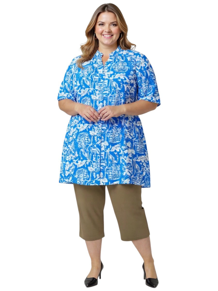 Balances the lower half beautifully. The bright, eye-catching print and buttoned neckline draw attention upward. The slightly relaxed fit around the hips ensures a smooth, flattering fall without clinging. The short sleeves help balance shoulder width with the hips for a well-proportioned shape.