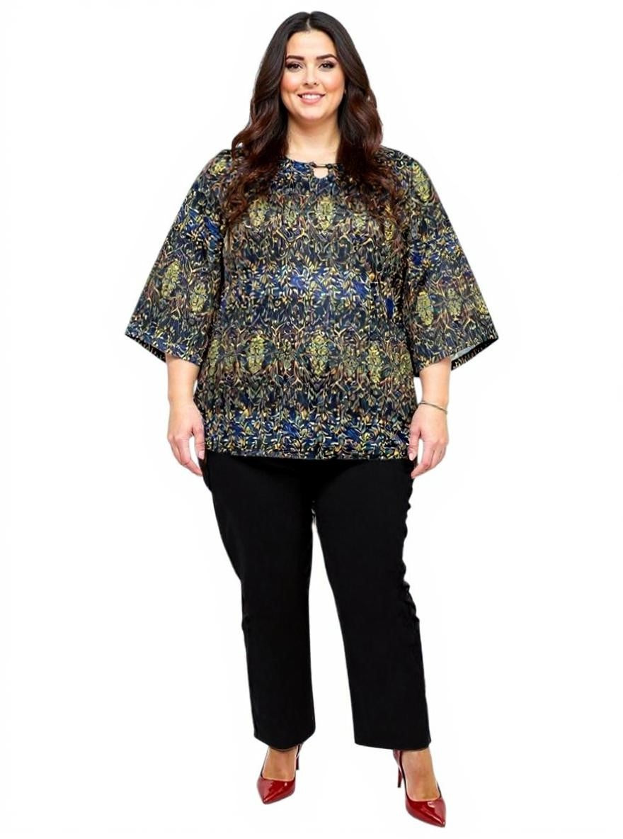 Fresh and fabulous skirt suit is back. This round neck printed, plus size, keyhole top in a navy/gold print, is a versatile look. With elbow length sleeves, It is lightweight and soft to wear with plenty of stretch for a comfortable fit. Mix and match with pants or capris, or team it with the matching Bernice Skirt for a stylish outfit