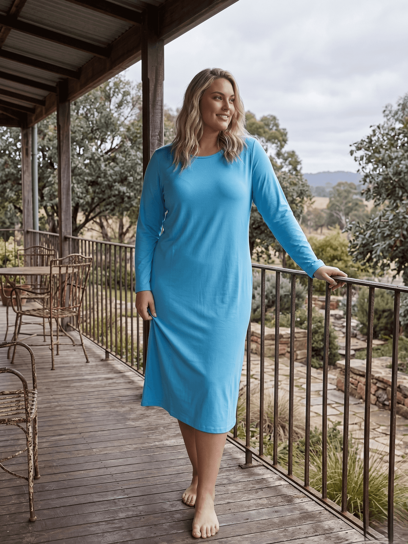 The Brayton Sleep Tee, in a serene cornflower blue, promotes a sense of calm. With a clean, simple round neckline and long sleeves (58cm) that provide warmth and comfort. With a relaxed, A-line silhouette, allowing 100% cotton fabric to drape softly from the bust down to the 125cm hem.