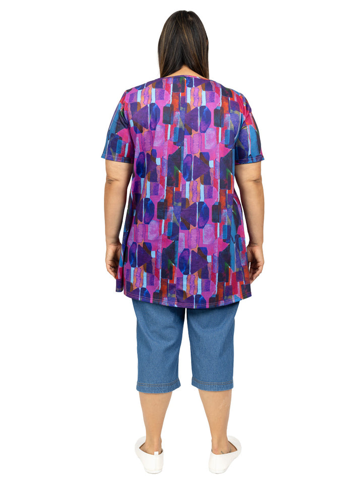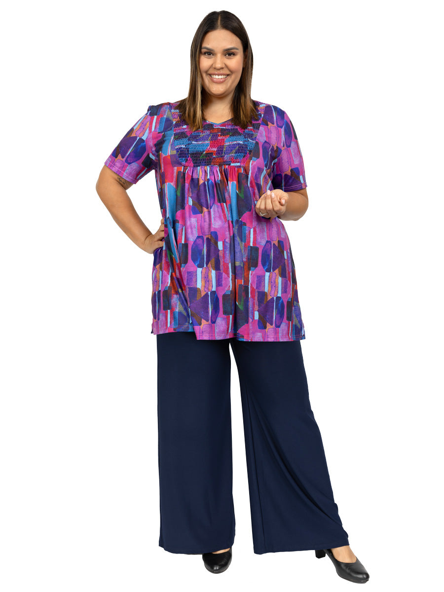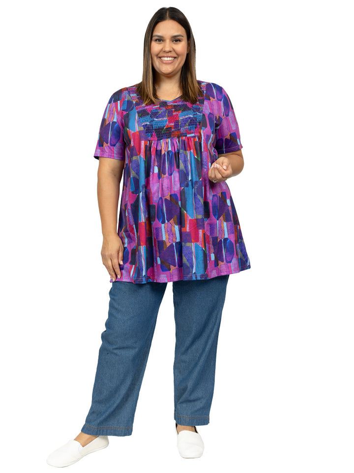 Beautiful, elegant purple print, women’s plus size bib front tunic with elastic shirred bodice is gathered from under the bust and with short sleeves and an A-Line shape with plenty of stretch for a comfortable and flattering fit. Team it it with jeans, pants or leggings for an easy, vibrant look.