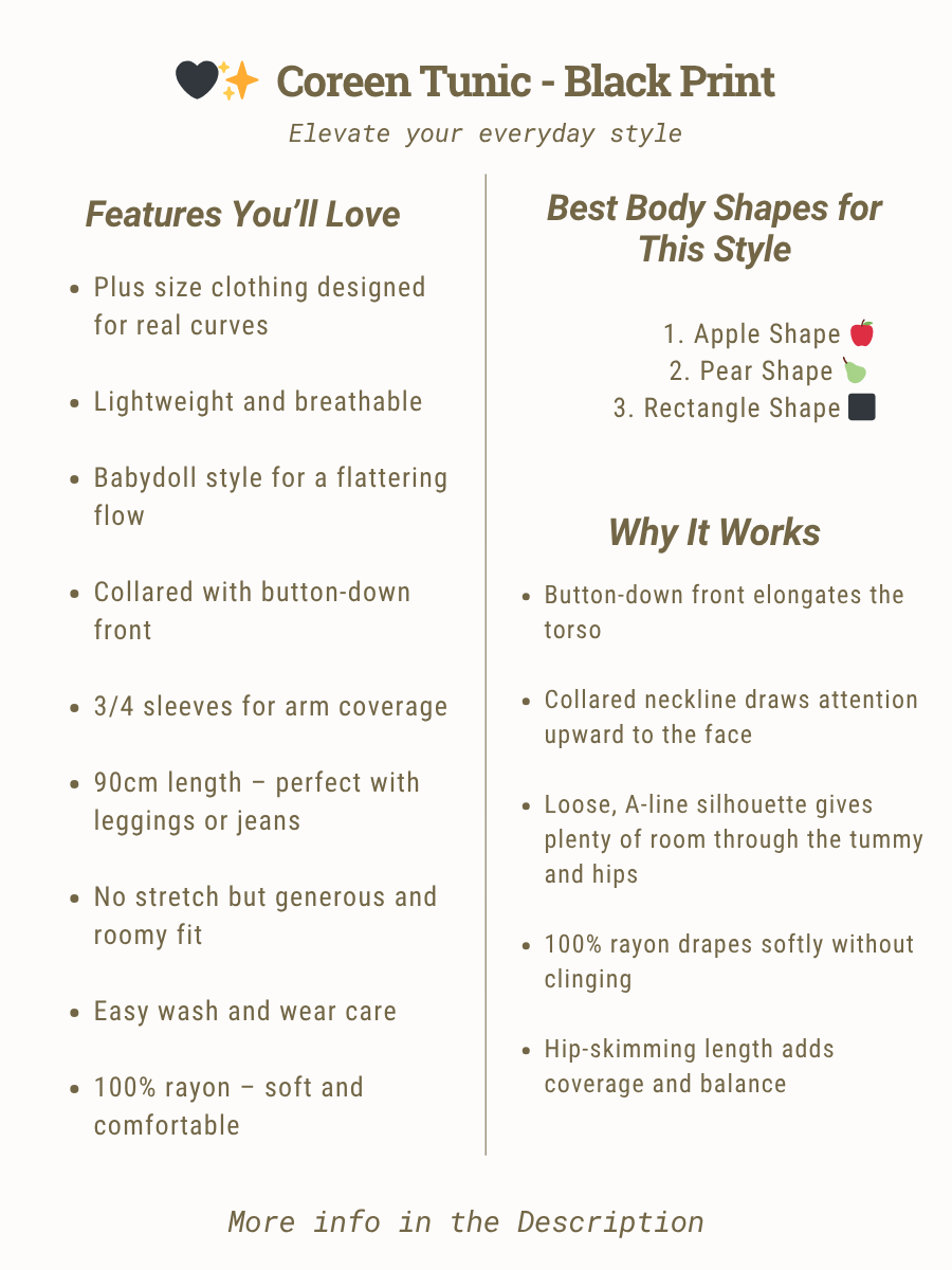Coreen Tunic - Black Print product details highlighting plus size, babydoll style, and breathable fabric features.