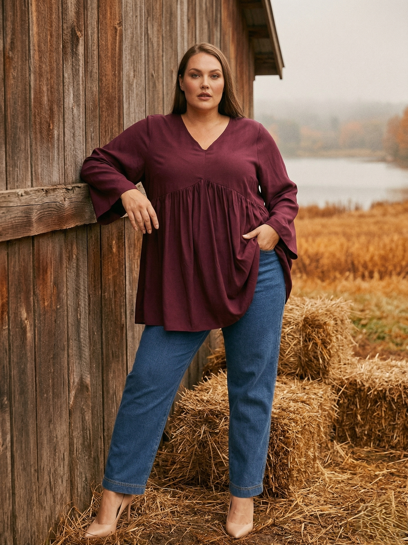 A stunning look to flatter any figure, this stylish, v-neck plus size tunic features high, peak seam detail under the bust with soft tuck pleats that flow into a graceful A-line cut, with long sleeves for warmth and a fabulously flattering silhouette, this lovely long tunic is perfect for any occasion.
