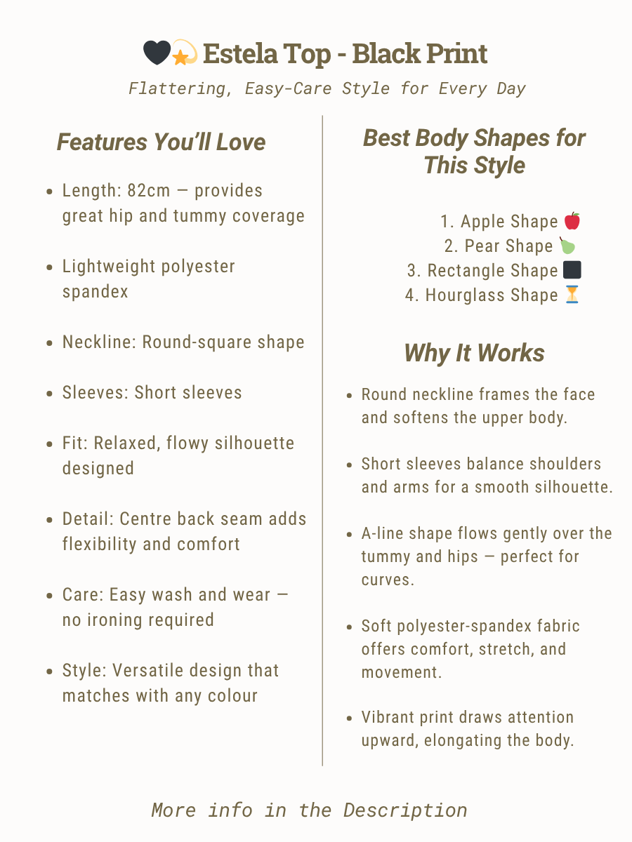 This piece is a true wash-and-wear essential — simply wash, hang, and go with no ironing required. Lightweight and versatile, it pairs effortlessly with all your favourite pants, skirts, or capris. Available in classic, mix-and-match colours, it’s a wardrobe staple that transitions beautifully from casual days to after-five style.