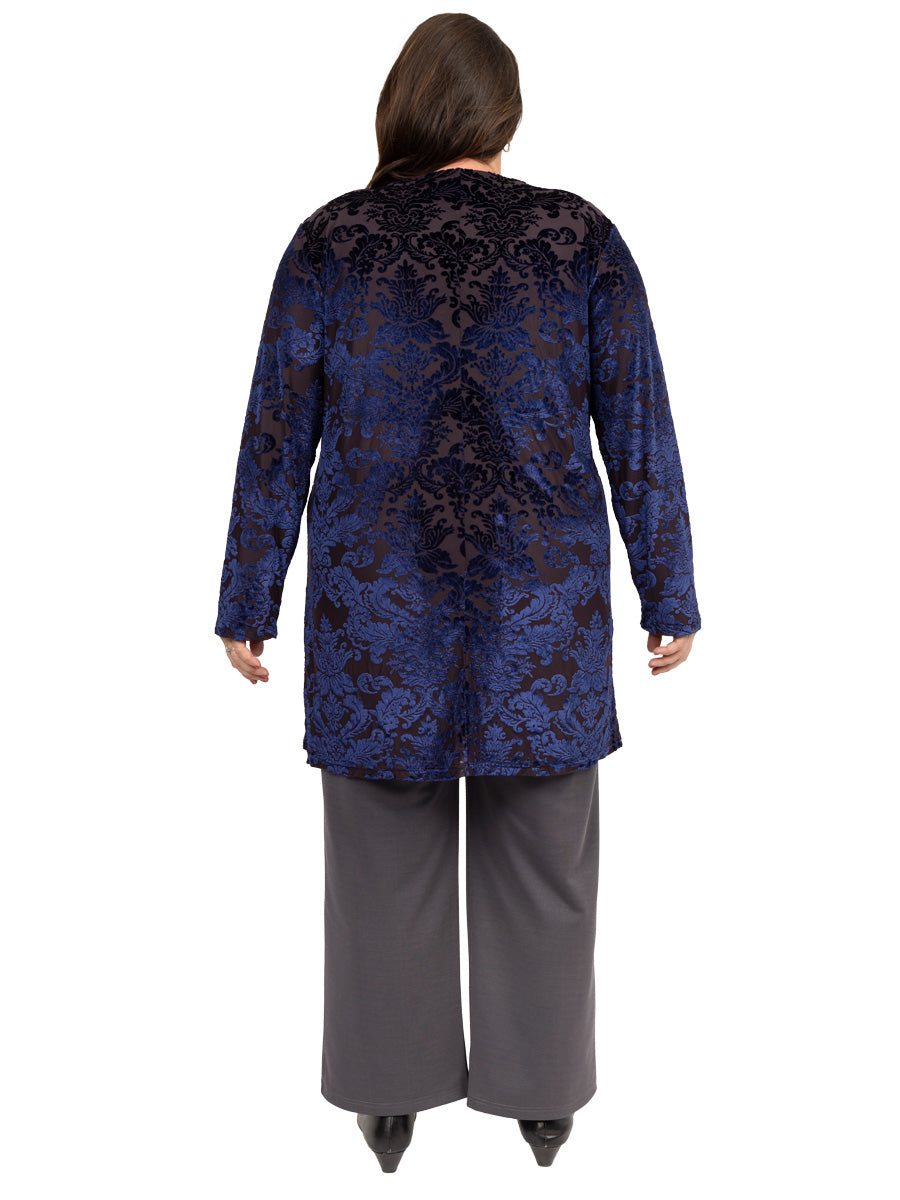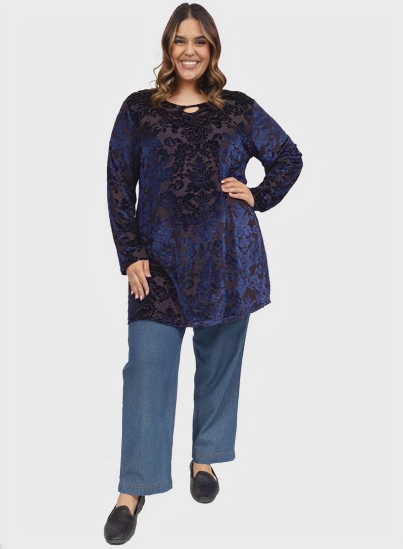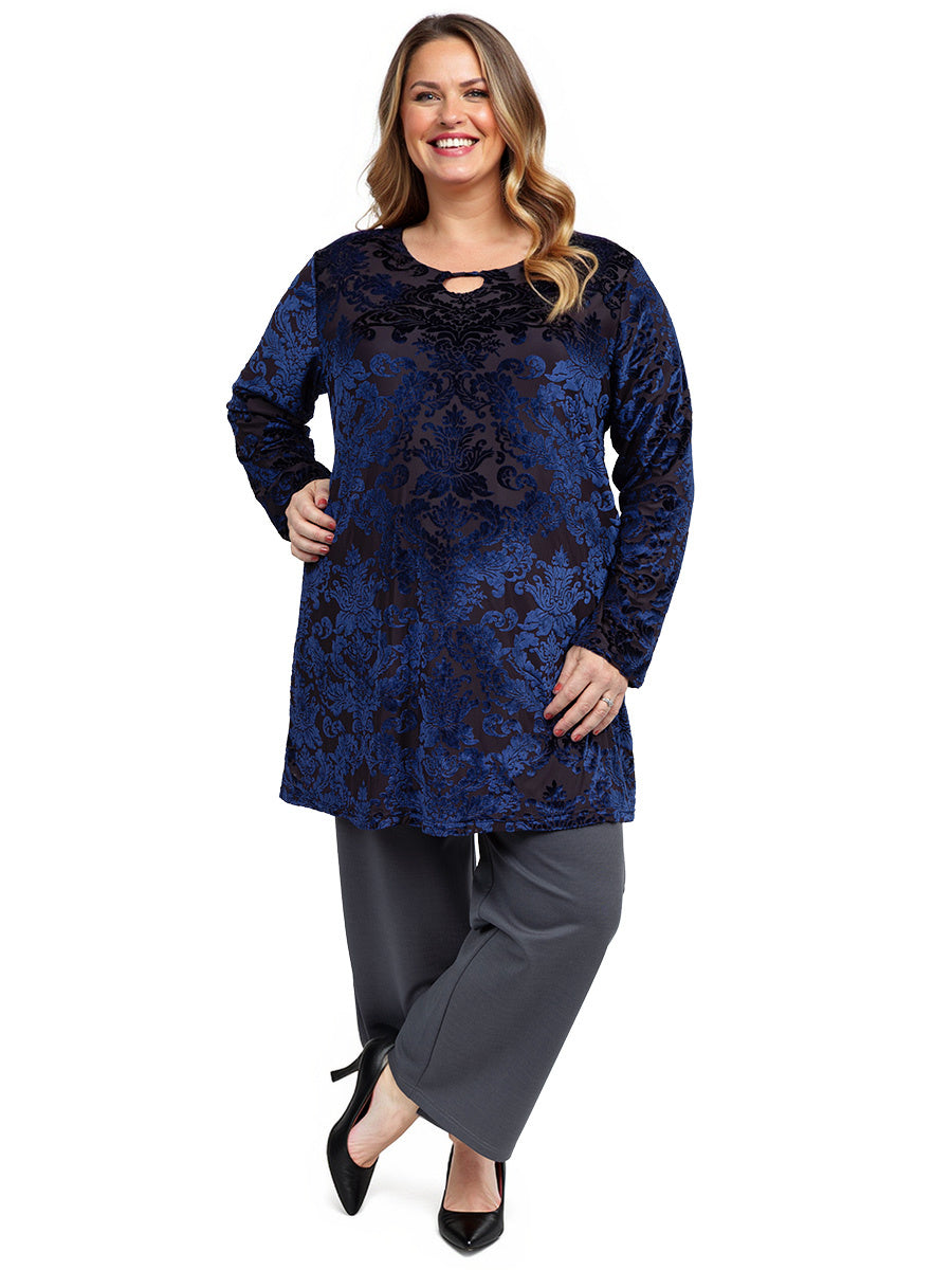 Elegant, soft and lightweight, this luxurious, long sleeved velour top features round-neck with keyhole in the front and a contrasting print in soft, Blue burnt velour on a black base. Soft and comfy to wear, with plenty of stretch, team it with your favourite stylish pants, skirt or jacket for a smart outfit.