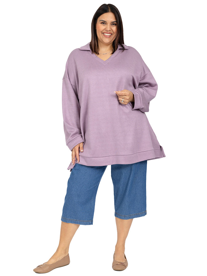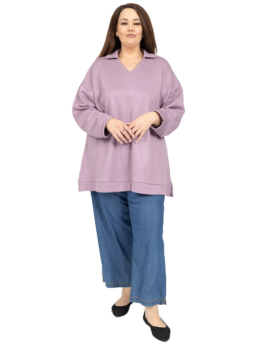 Wrap yourself in warmth this winter with our soft, cosy women’s plus size swing jumpers. A stylish blend of comfort and style, featuring v-neck with rib collar and long sleeves with cuffs and collar. With wide band and side splits in the hem for extra ease and movement, these jumpers are made to keep you cosy & snug. Available in Lilac & Charcoal, they’re your cold-weather essential.