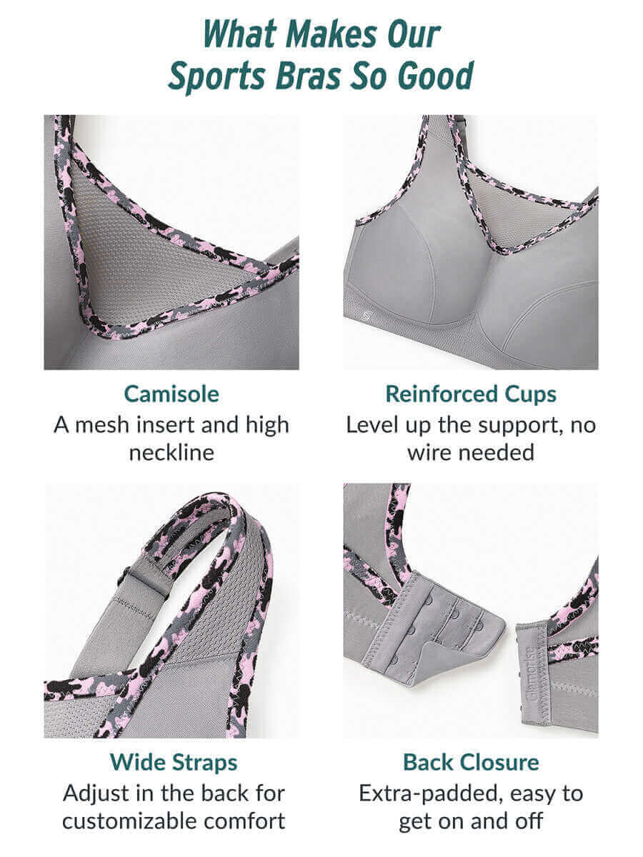 Winning at Coverage & Control. The original camisole sports bra where upper bust containment and bounce control team up. This plus-size sports bra features a mesh-insert camisole design that's equal parts breathable comfort and full coverage.