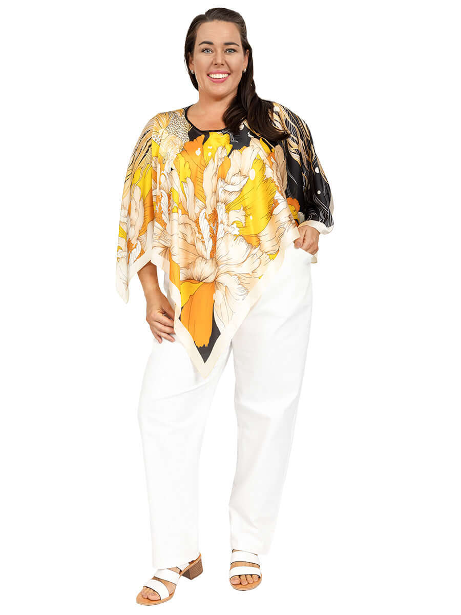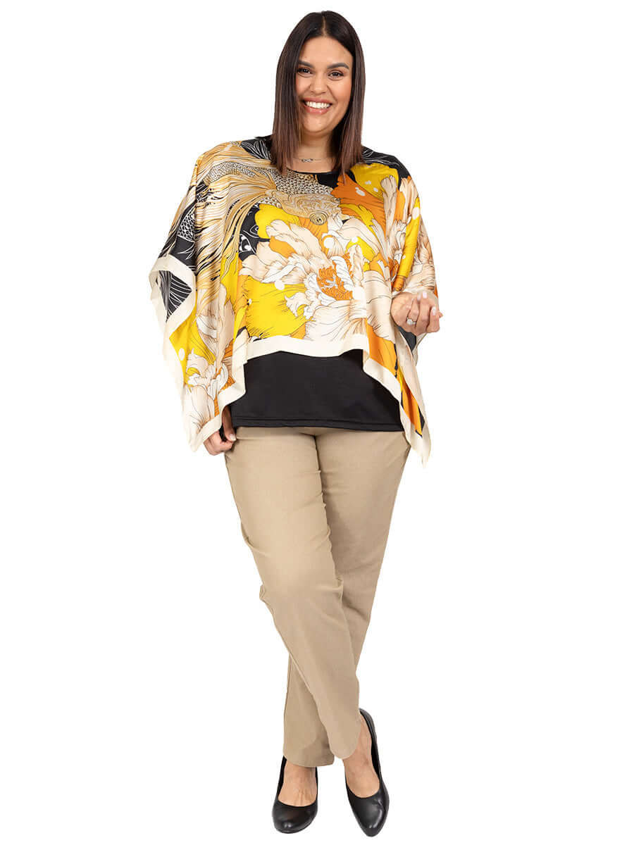 Elevate your style with this elegant Gold print satiny shawl. Light, airy, and effortlessly chic. Its smooth, silky texture drapes beautifully, adding just the right touch of sophistication to any outfit. Perfect for layering.