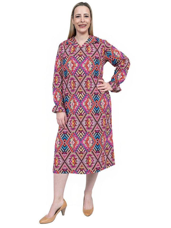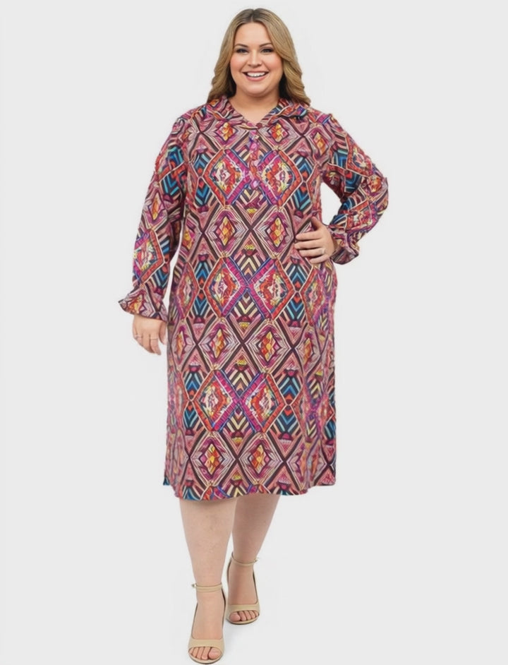 Lightweight, stylish and vibrant look for spring, this smart, printed plus size dress features long gathered sleeves with elastic cuffs and a shirt style collar with 4 button closure at the neck in a bold tapestry style print.