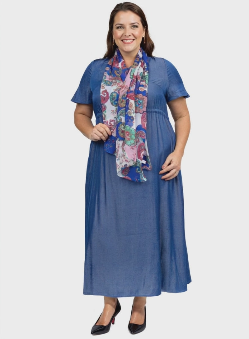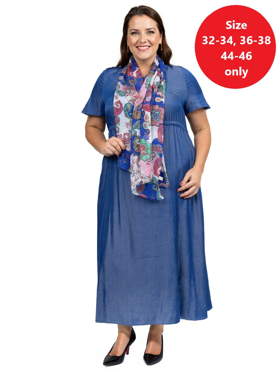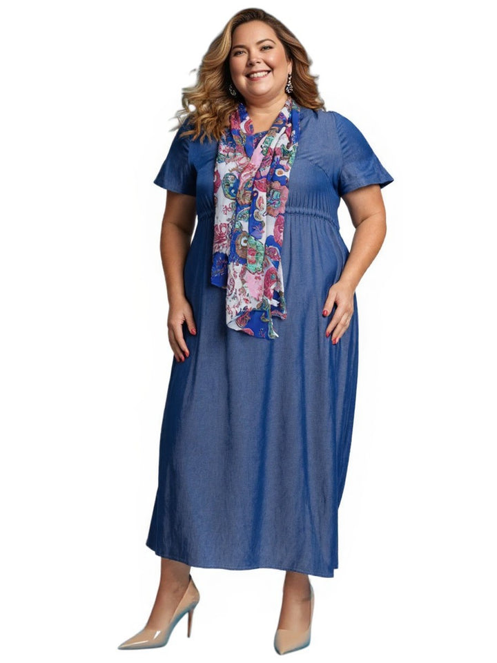A stylish look for summer, this soft, lightweight Women’s Plus size denim blue tencel dress is soft and lightweight with capped sleeves and v-neck and a draw string waist and a soft flowing drape, with swing though the hem for a comfortable fit.