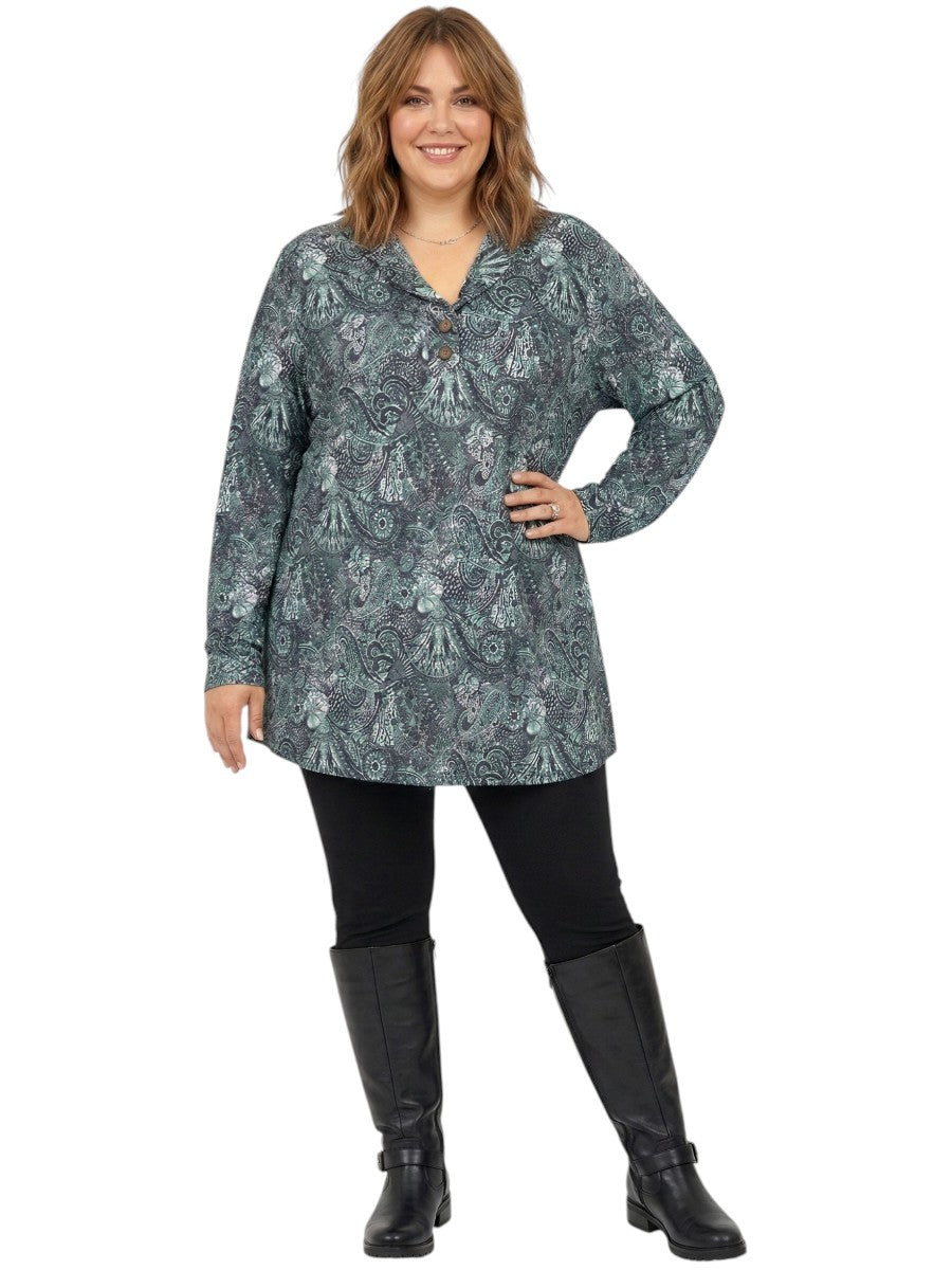 Stay warm in style with our comfy plus size, long-sleeve jumpers, featuring a cosy shawl collar and a classic two-button front for a relaxed, polished look. Available in a stylish green print and a rich olive, these jumpers blend comfort with modern flair you’ll love. Perfect for layering for those cooler days.