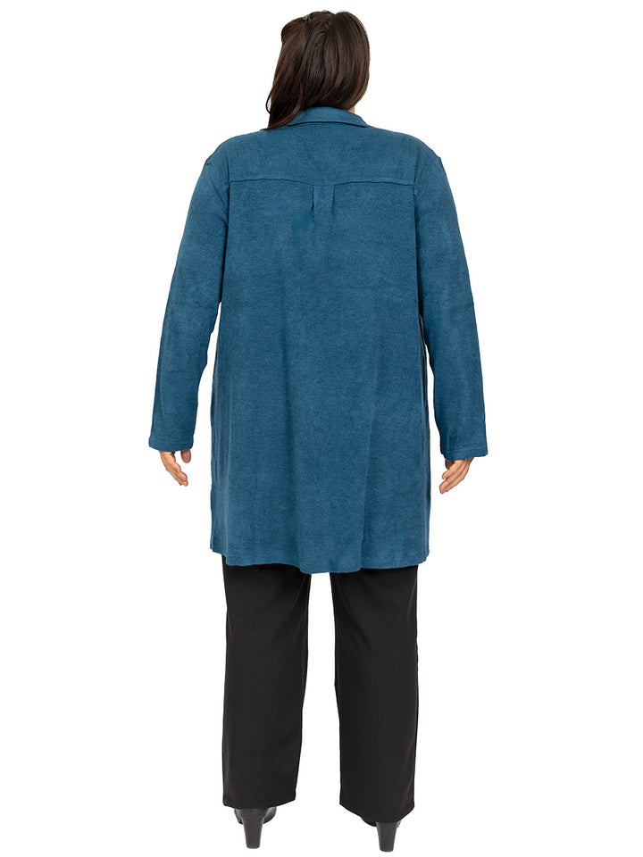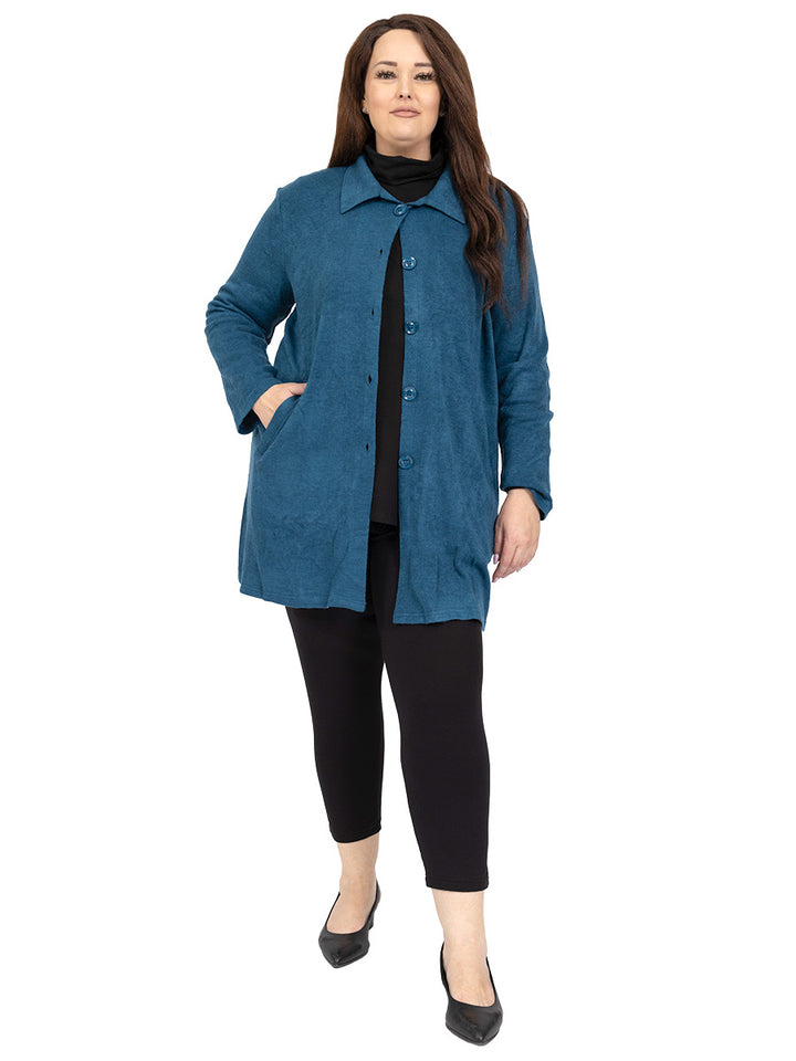 An old favourite jacket is back! Stay warm in style with this soft, cosy and lightweight women’s Plus size winter jacket. Perfect for those chilly days without the bulk. As cuddly as your favourite cardigan but with the refined look of a classic pea coat. Available in vibrant teal and timeless grey, it features long sleeves, a smart shirt-style collar and front slash pockets for a versatile layer winter look.