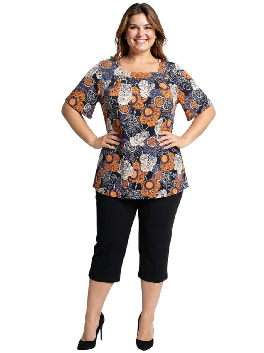 This top features a bold, artistic floral print with a vintage-inspired aesthetic. The colour palette is a sophisticated mix of deep navy blue, vibrant burnt orange, and crisp white. The "Lora Top" has a relaxed, flowing silhouette designed for comfort and effortless style.