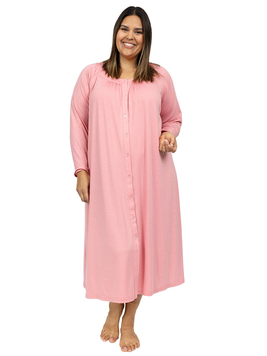 Soft, lightweight dressing gowns are back. These beautiful women’s plus size dressing gowns feature long sleeves, button front and gathered from the neck for extra room. Choose from Purple, Pink and Blue, you can wear them alone as a button up nightie, or team them with matching printed nightie for a pretty sleepwear set to make you feel pretty.