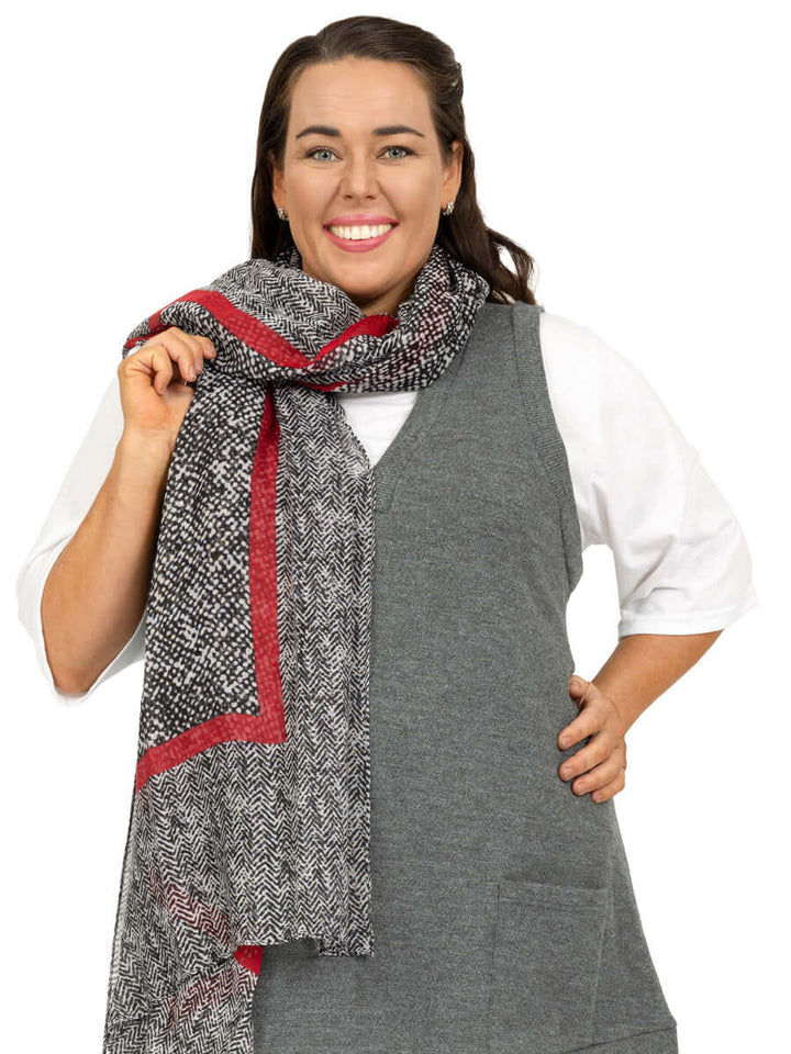 A stylish, classical look to upstyle your everyday wardrobe. A must have for your accessories wardrobe, you’ll love this pretty, slinky black printed scarf with stunning red detail. Soft and light with a stylish flowing drape for a fabulous look for work or play.
