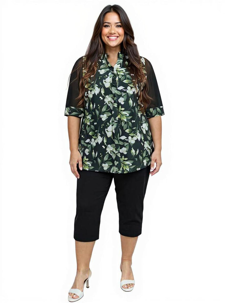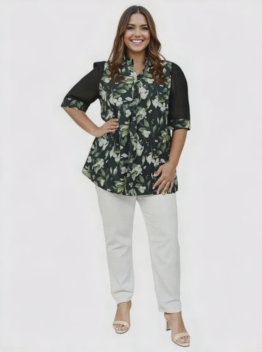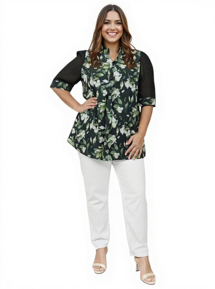 A sensational new look for spring, this lightweight, women’s plus size emerald and black printed blouse is sure to turn heads. With mandarin collar and printed through the body, it features contrasting black sleeves with coordinated print cuffs. With button front and pleated from under the bodice for extra swing through the hem.