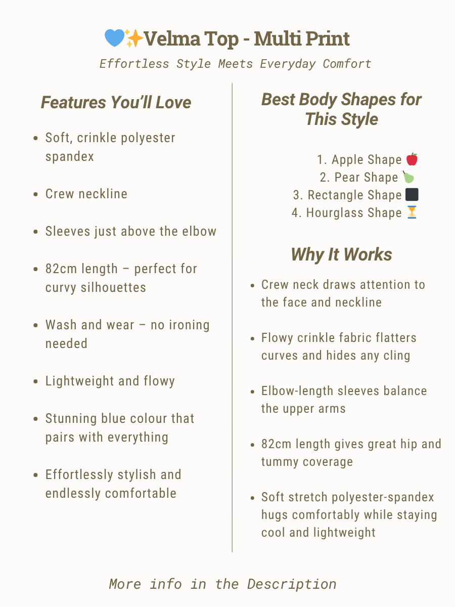 With a length of approximately 82cm, it falls perfectly over the hips for a flattering fit that complements every body shape. The lightweight, easy-care fabric makes it ideal for office wear, casual days, or after-5 outings — simply pair it with your favourite pants, skirts, or capris for a polished, put-together look.