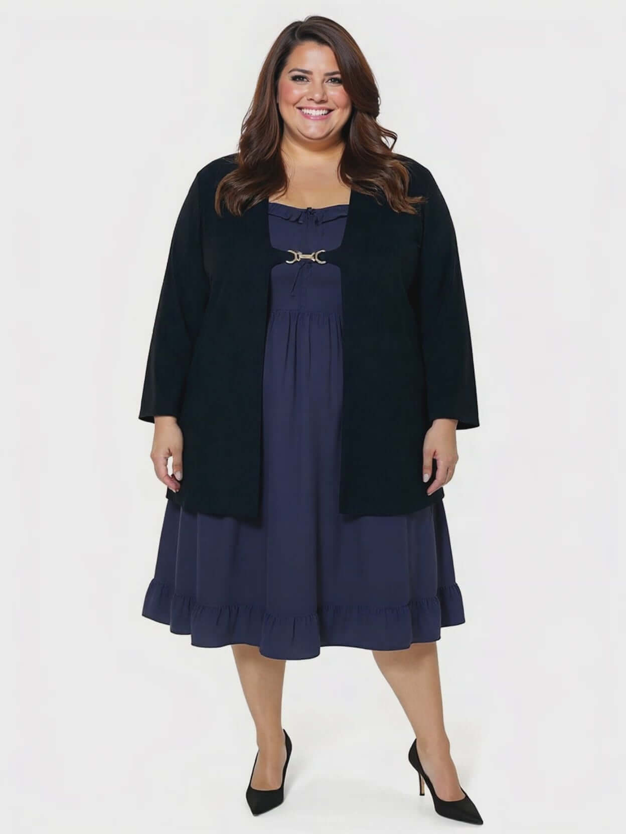 Plus size model wearing a black Mercedes E2E cardigan over a stylish blue dress, showcasing a trendy layered look.