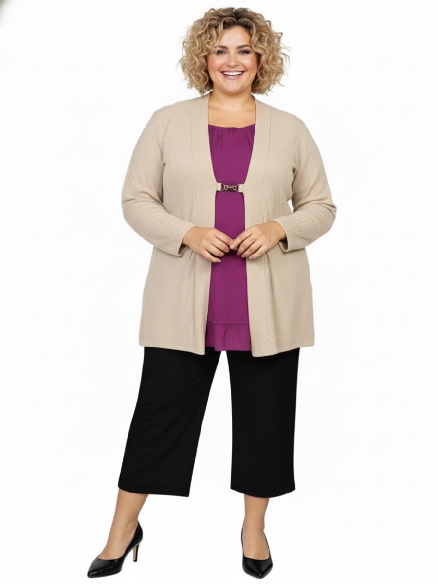 Women’s plus size model wearing Dale and Waters Mercedes E2E Cardi in stone with black culottes and red top.