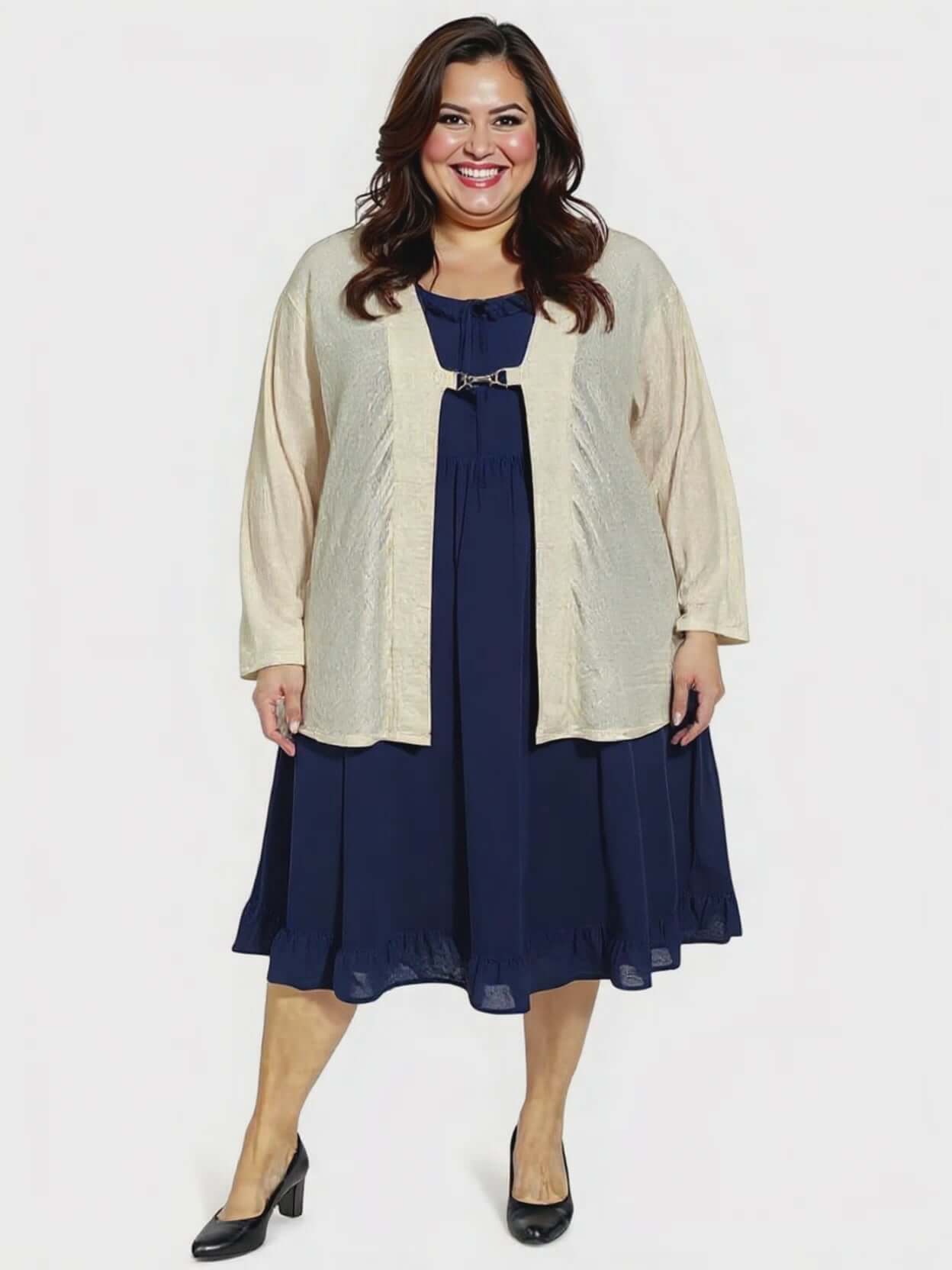 Plus size women's Mercedes E2E Cardi in stone, paired with a navy dress, showcasing stylish layering options.