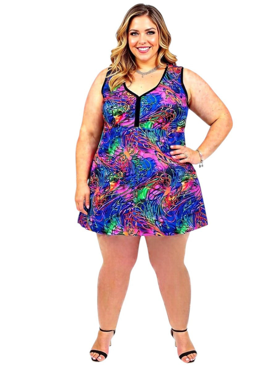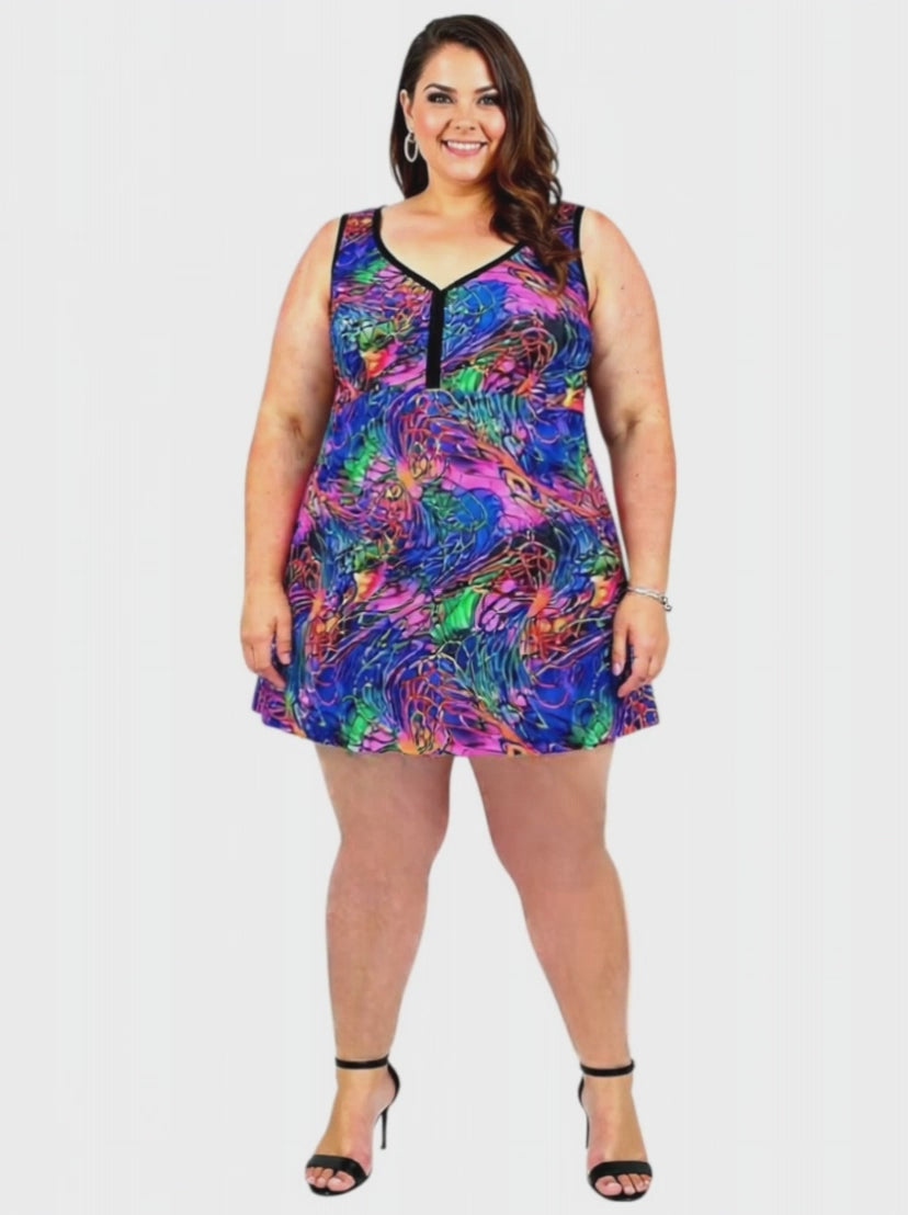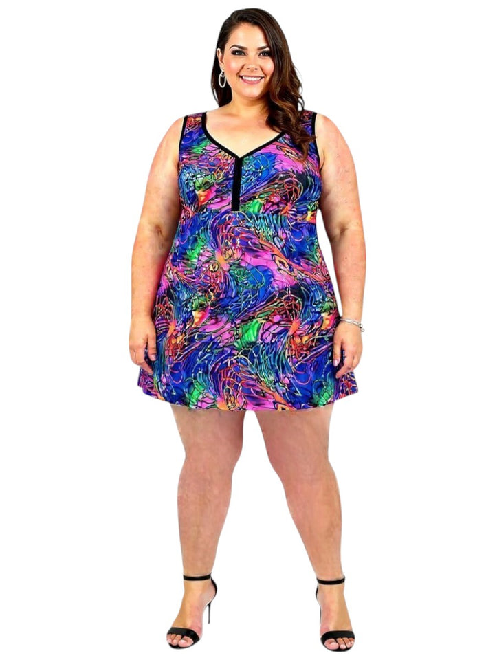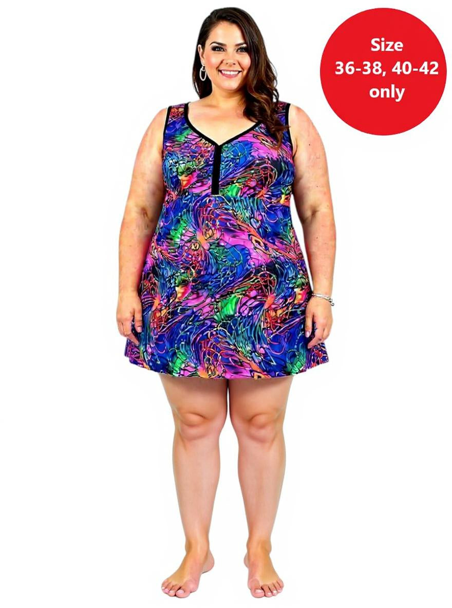 Beautiful, one piece, plus size swim dress with a bright, fresh print. Features V-neck bodice with centre seam with wide shoulder straps and cups in the bust for added support. Joined at the under bust seam with full printed skirt to give extra coverage and a comfortable fit. Perfect for swimming, aquarobics and all your favourite water activities