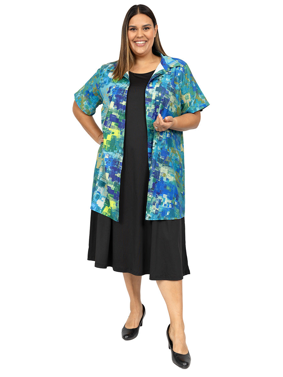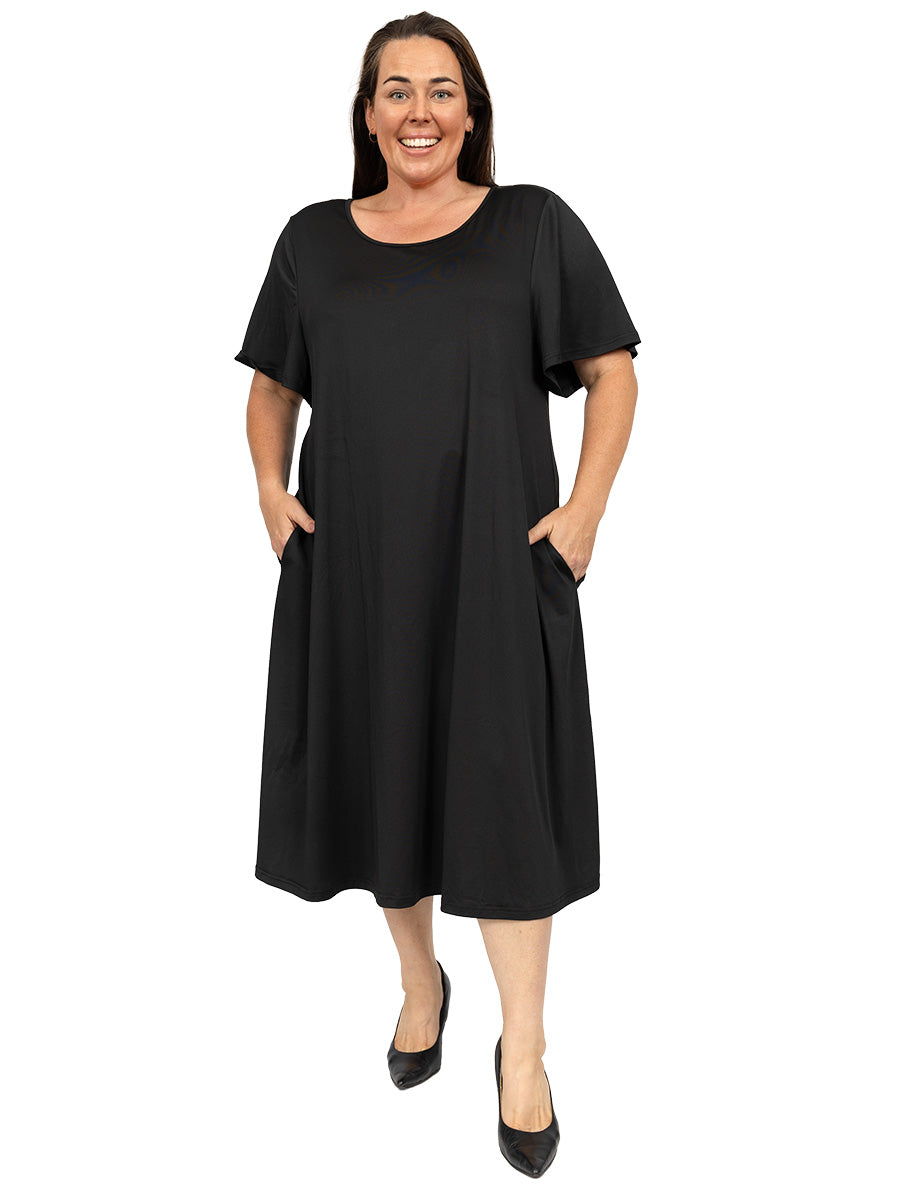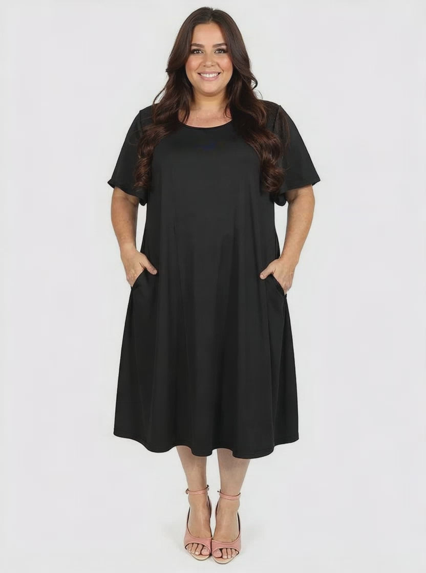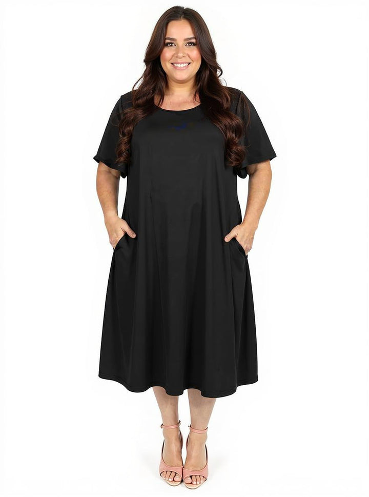 This classic black women’s plus size dress is a must for any season. Stylish and easy to mix and match, this elegant, go-anywhere ‘little black dress’ is lightweight and comfortable with round neck, elbow-length sleeves with swing though the hem for a flattering fit. It even has pockets!