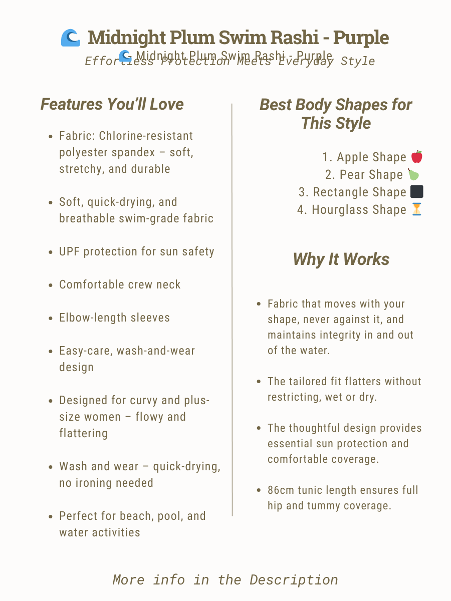 The timeless classic purple shade is truly a standout, designed to mix and match effortlessly with nearly everything in your swim wardrobe — from printed bikini bottoms to solid swim shorts or board shorts. Whether you’re swimming laps, lounging poolside, or enjoying a beach walk, this rashie delivers comfort, confidence, and easy sun-smart style in every splash.