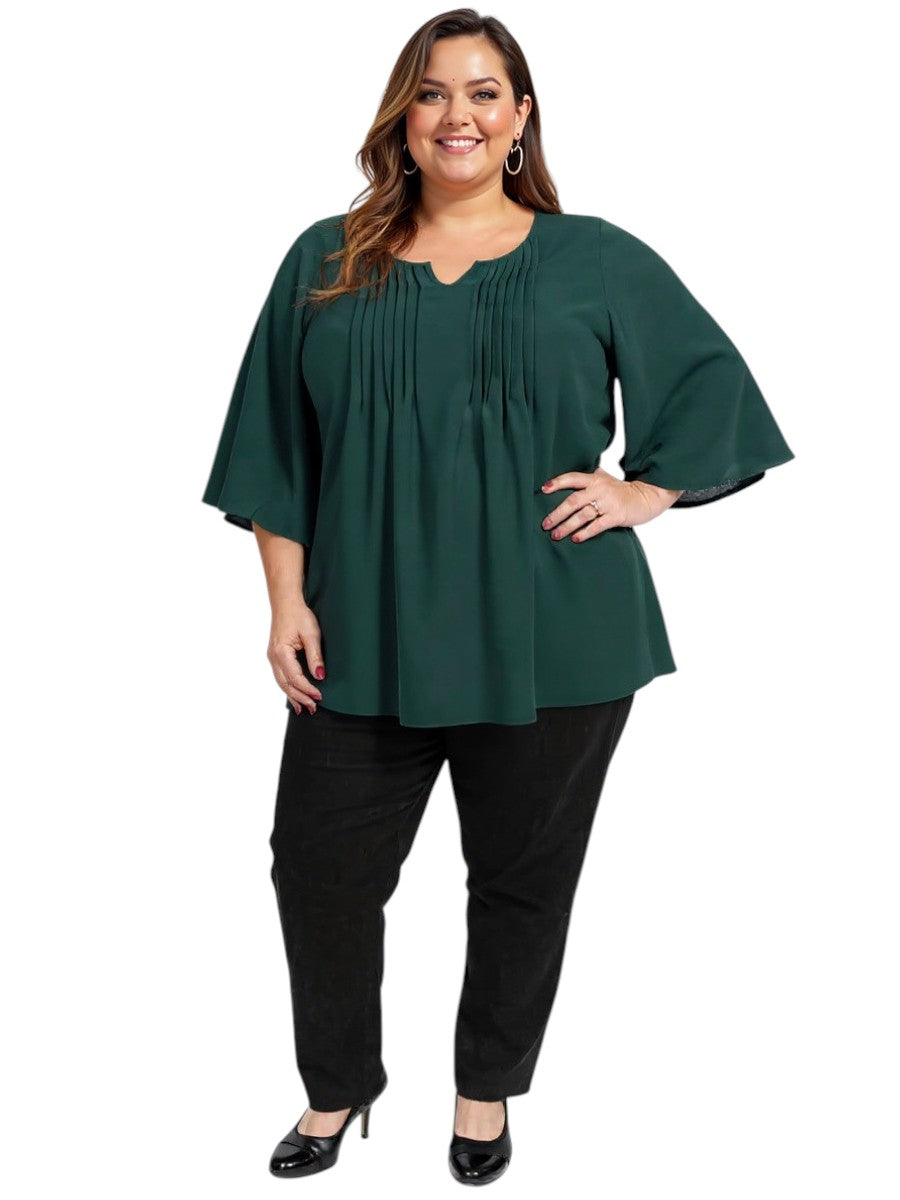A sensational look for Spring, this bright, stylish plus size top is perfect for any occasion. Dress it up or down, available in an elegant, classic green, or as a fabulous, print, it features generous 3/4 bell sleeves with pleated front and gathered from under the bodice to give plenty of room over the arms and hips.