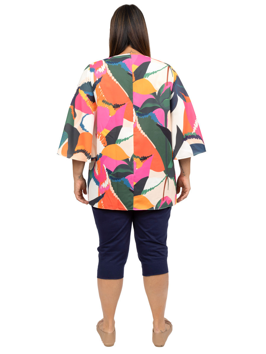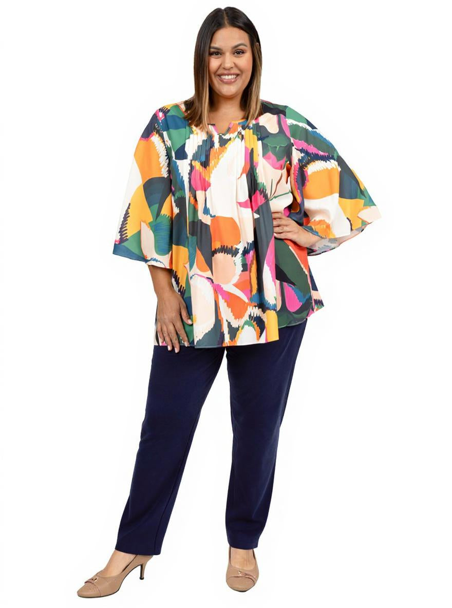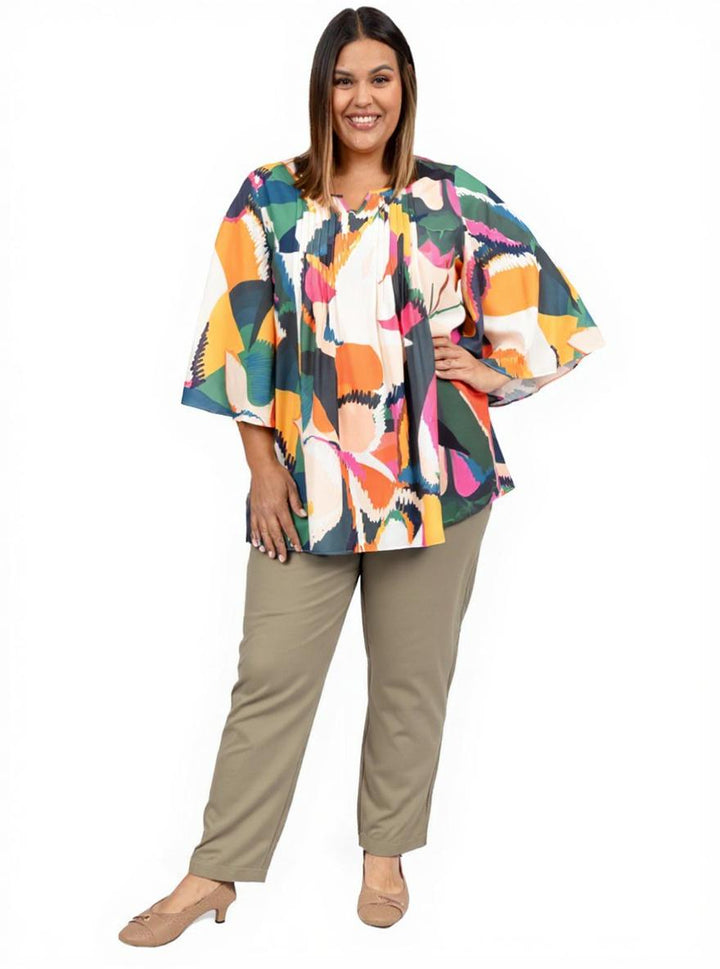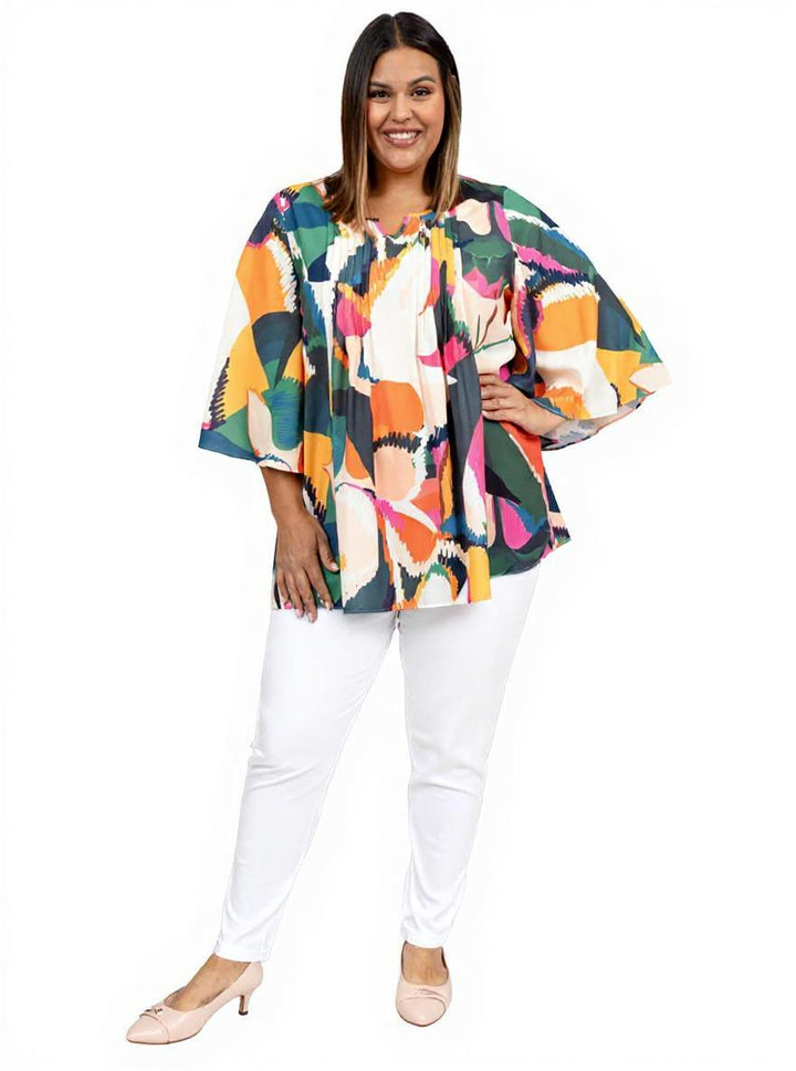 A sensational look for Spring, this bright, stylish plus size top is perfect for any occasion. Dress it up or down, available in a gorgeous bright print, or in an elegant, soft green, it features generous 3/4 bell sleeves with pleated front and gathered from under the bodice to give plenty of room over the arms and hips.