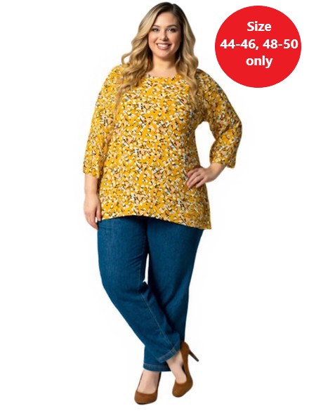 Light, bright, and beautiful plus-size top, adorned with a stunning yellow print – the perfect addition to your wardrobe for those warm spring and summer days. Crafted from lightweight fabric, this top keeps you cool and comfortable all day long.