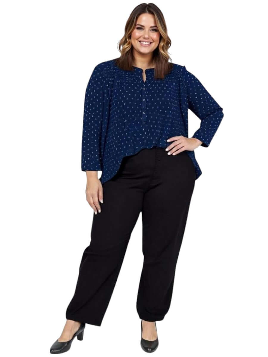Neckline detail with buttons → draws the eye up, flattering the face and bust.