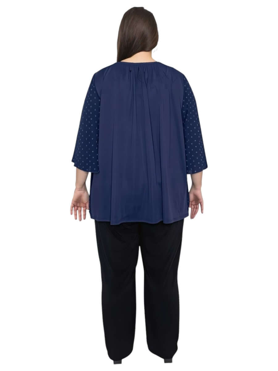 The back is made from soft jersey spandex, offering generous stretch and a smooth, flowing feel. Designed with pleats at the back neckline for added ease, this top blends structure and comfort effortlessly—perfect for both casual and elevated occasions.