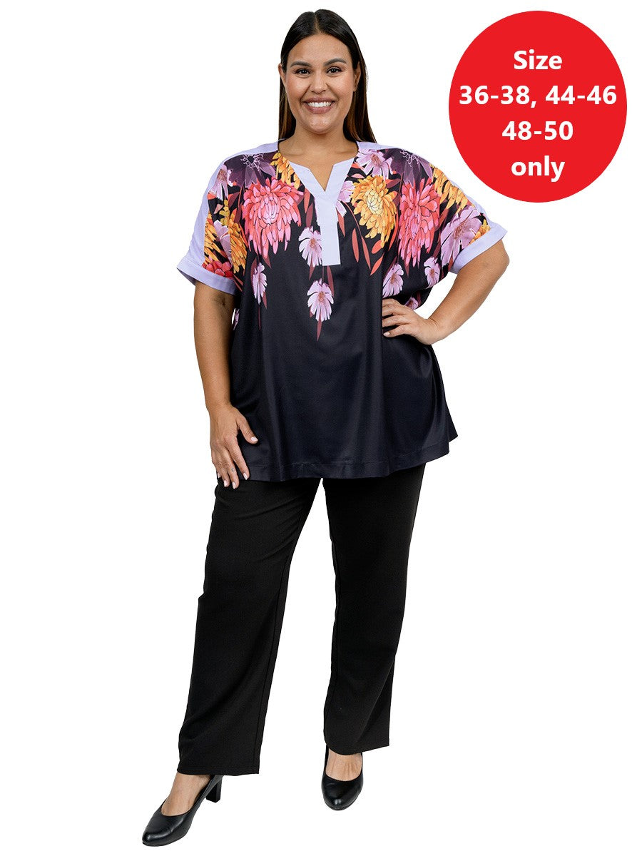Pretty and lightweight with a fresh floral print, this top is a stunning look for spring and summer. So light and soft to wear, it features short, batwing sleeve cut in one peice, with a bright floral print to draw the eye, with a lovely lilac trim at the shoulders, cuffs and front neckline. Dress it up or down, perfect for any occasion