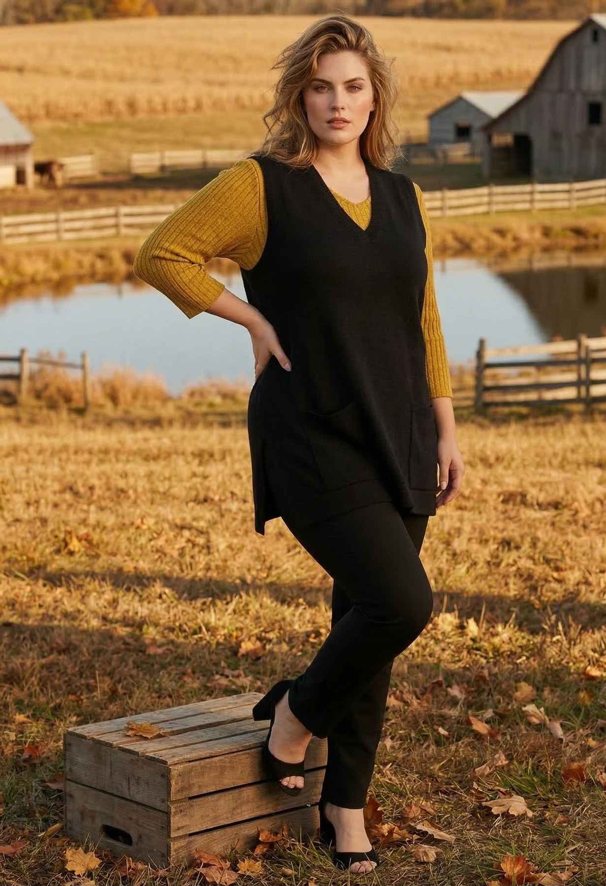 Bottoms: Slim-fit trousers, leggings, or skinny jeans to balance the roomy volume of the vest.