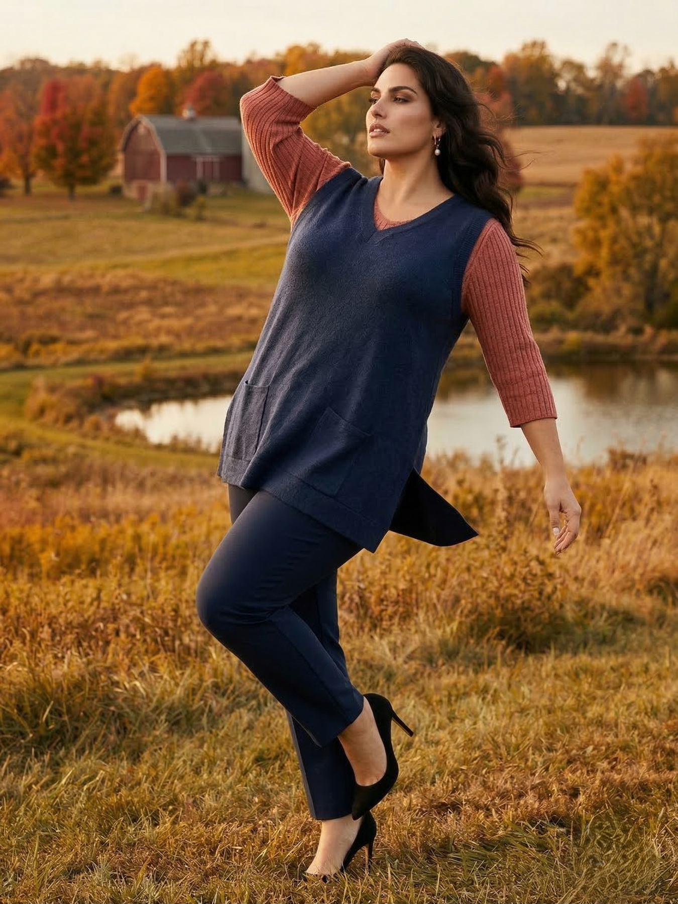 This vest is a "curvy wardrobe" essential because it focuses on vertical lines. The V-neck and the 84cm length create a continuous vertical visual, which elongates the torso. The A-line cut ensures that the garment doesn’t cling to the stomach or hips, providing a polished look that feels secure and flattering.