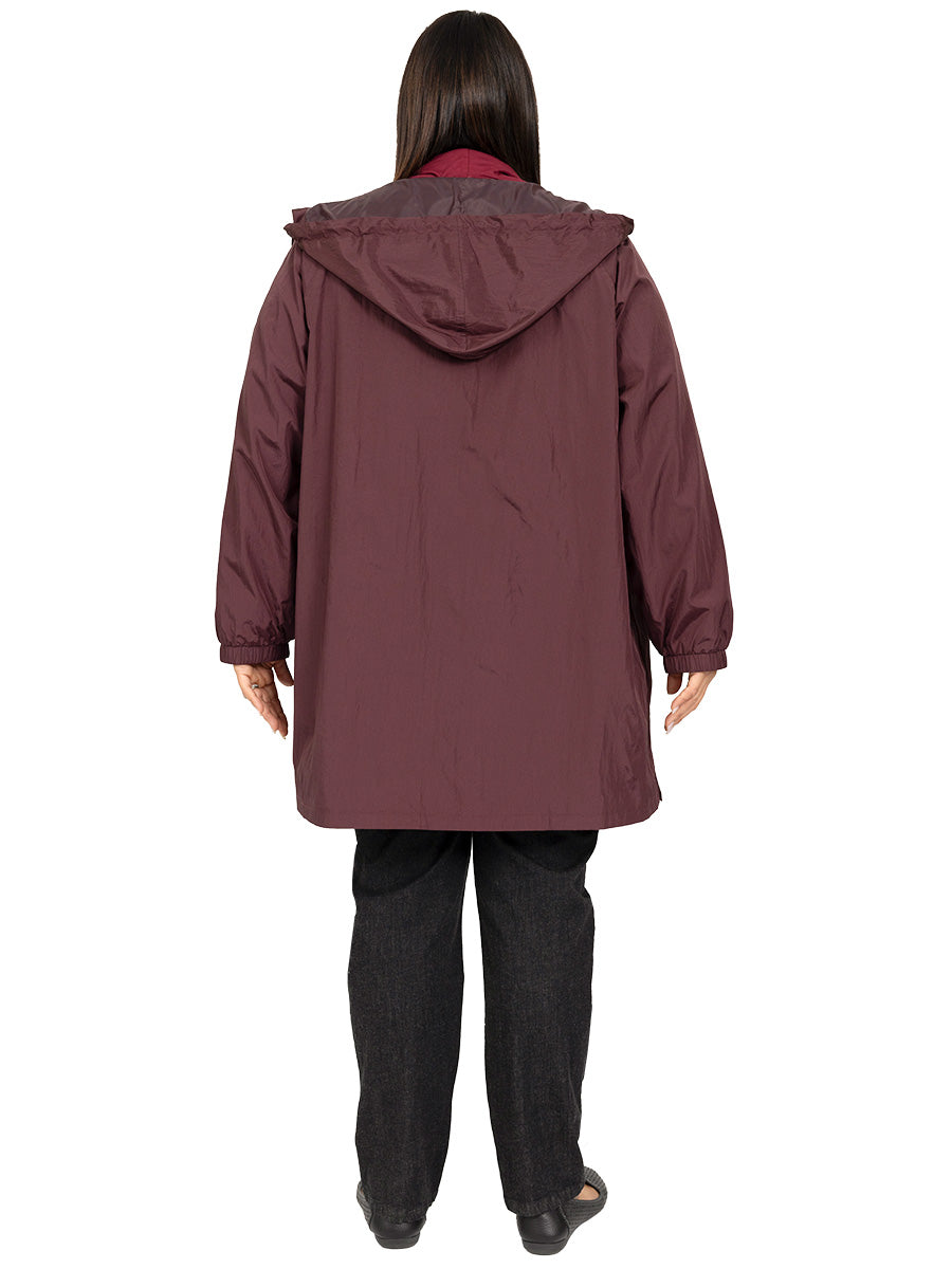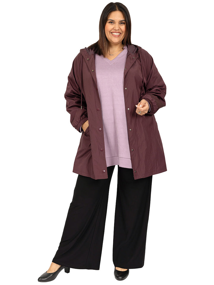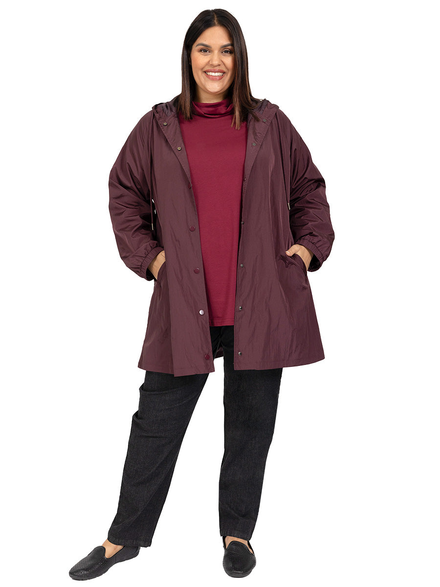 Lightweight, Waterproof, Raindrops women's plus size Parka is back in an elegant wine. Perfect to keep out the weather. Long sleeved with elastic cuffs, it is fully lined with drawstring hood, snap fasten front and side pockets. Beautifully made, this stunning jacket will last you for years.