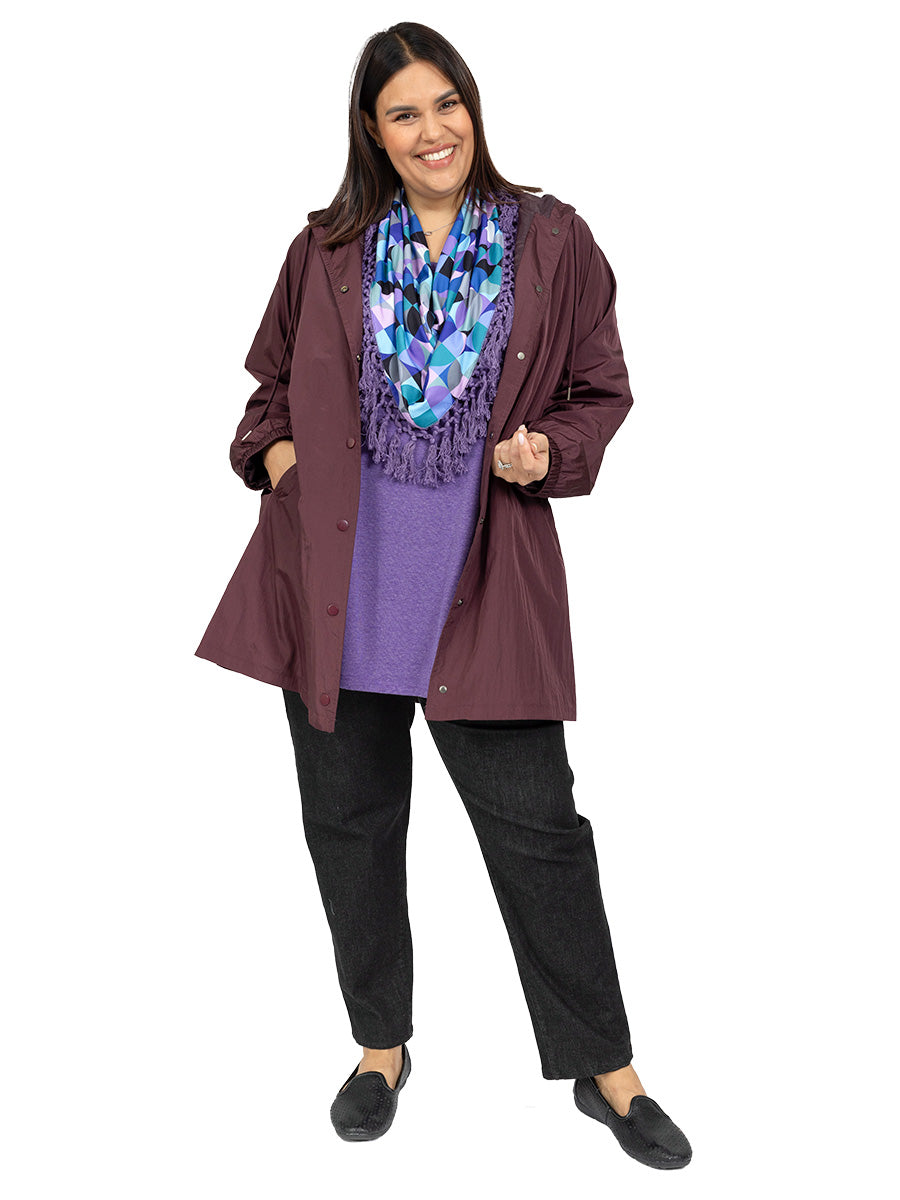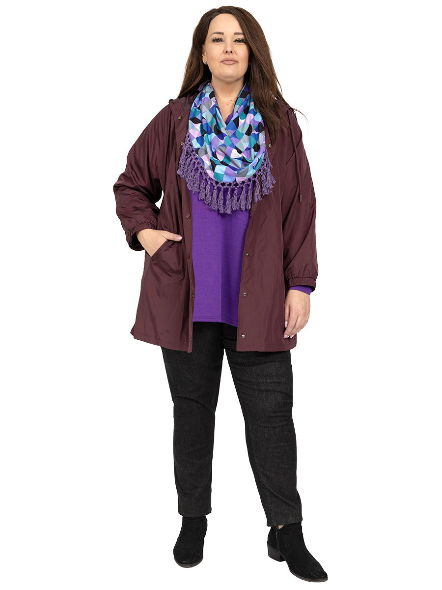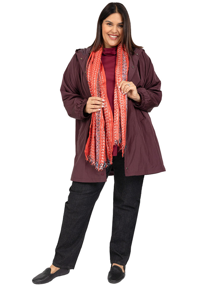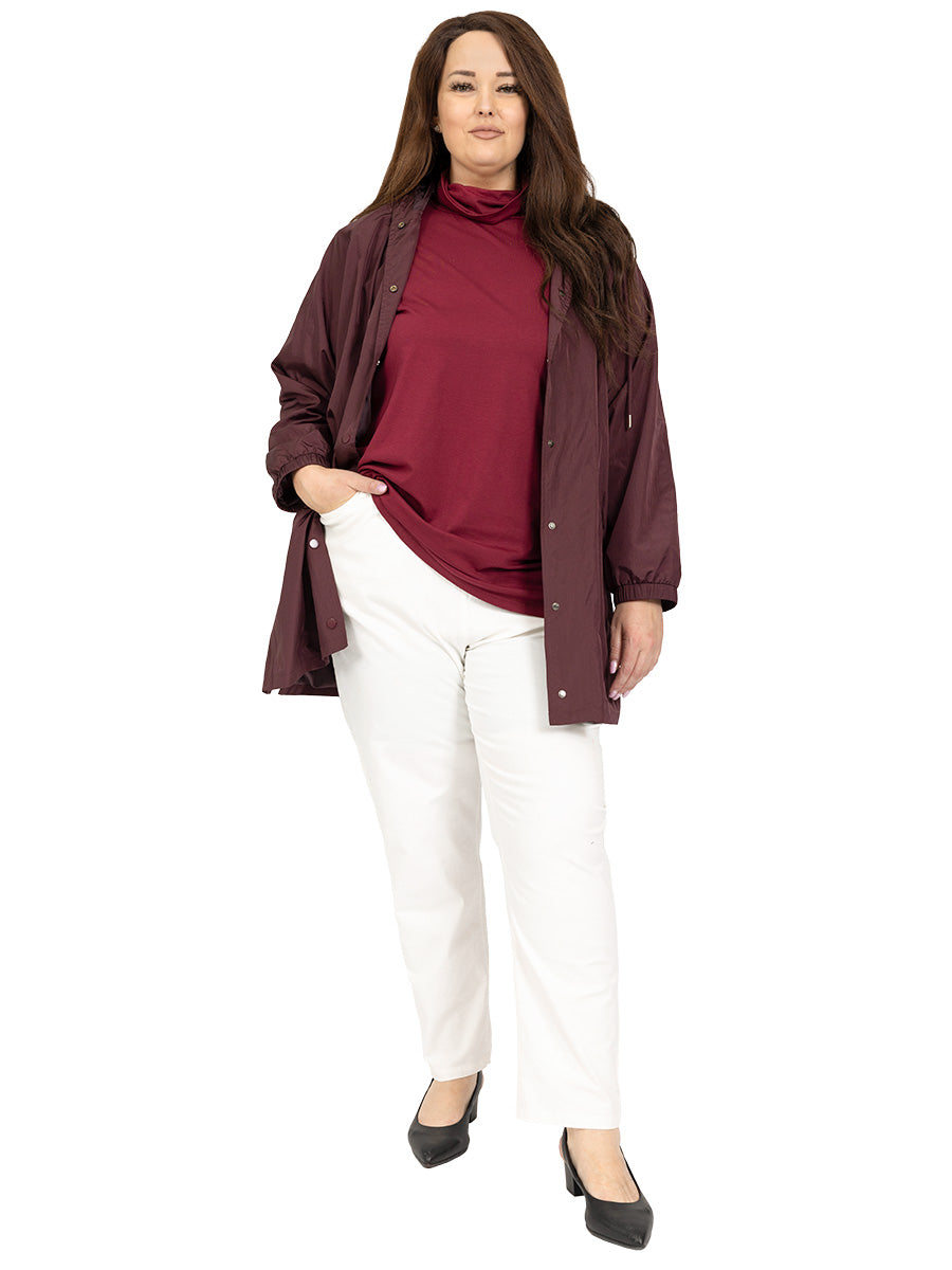 Lightweight, Waterproof, Raindrops women's plus size Parka is back in an elegant wine. Perfect to keep out the weather. Long sleeved with elastic cuffs, it is fully lined with drawstring hood, snap fasten front and side pockets. Beautifully made, this stunning jacket will last you for years.