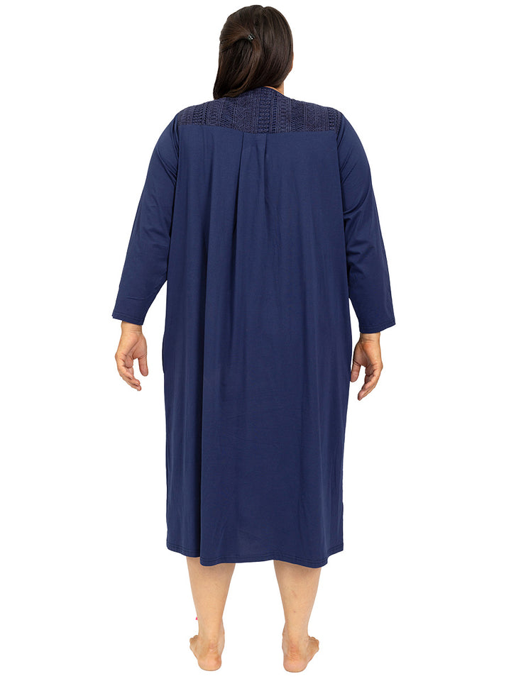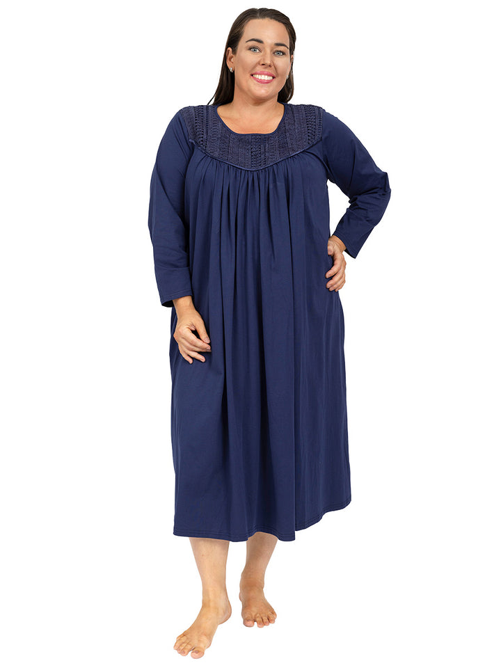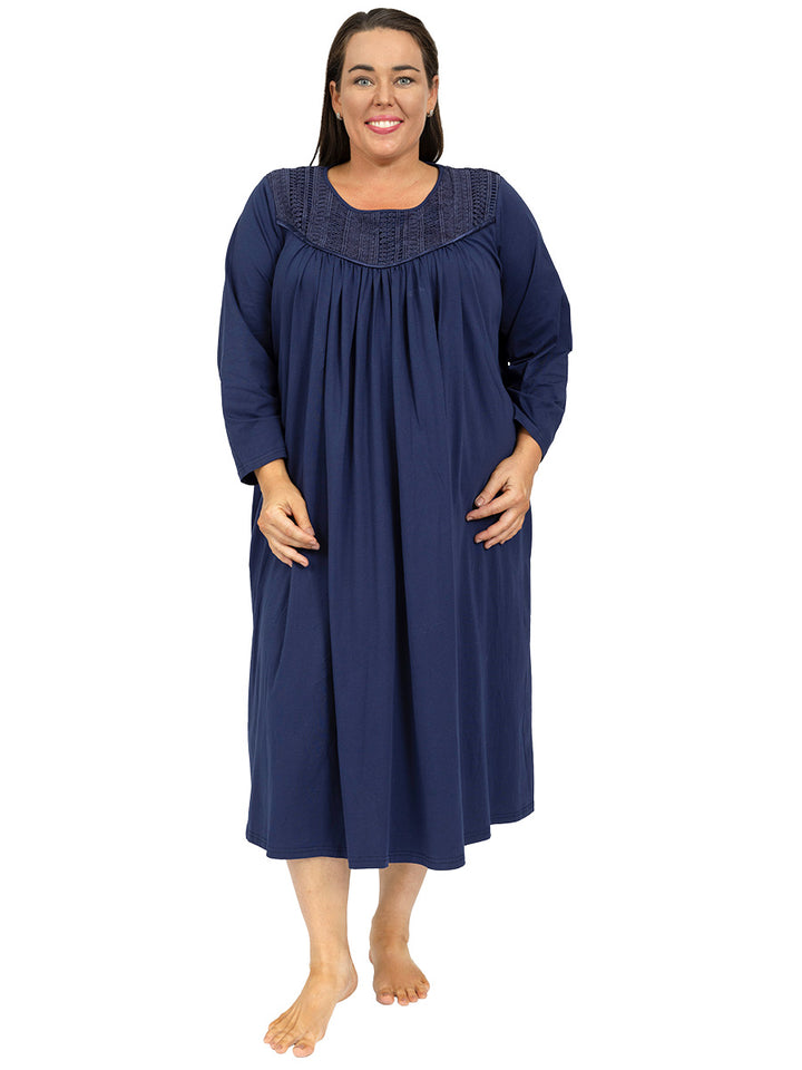 Relax and sleep in comfort. This stunning, cotton-rich women’s plus size nightie in ready for Winter. With round neck and long sleeves, it features lovely, lined lace detail on the bodice and back yoke, with coordinated satin ribbon detail. Perfect for winter, it is available in Cranberry, Midnight Blue & Sea Green