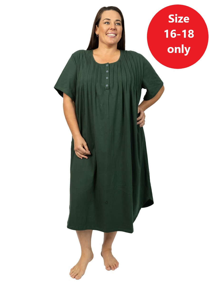 So soft and comfy, this stunning, plus size, women’s pleated green cotton nightie is cool and comfy and perfect for those summer evenings. With pin-tuck front with button front at the neck with short sleeves and a shirt tail hem for a comfortable fit.