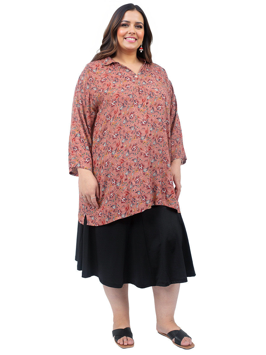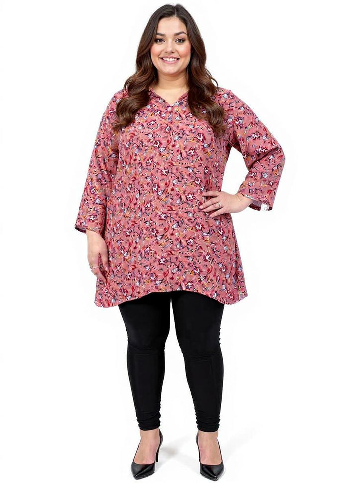 Pretty and lightweight plus-size printed blouse, crafted from a beautiful and breathable Viscose Crepe fabric. This blouse is designed to keep you comfortable and stylish all day long. Featuring elegant 3/4 sleeves, a flattering v-neck, and a classic shirt collar with non-functioning button detail at the neck, this blouse exudes sophistication.