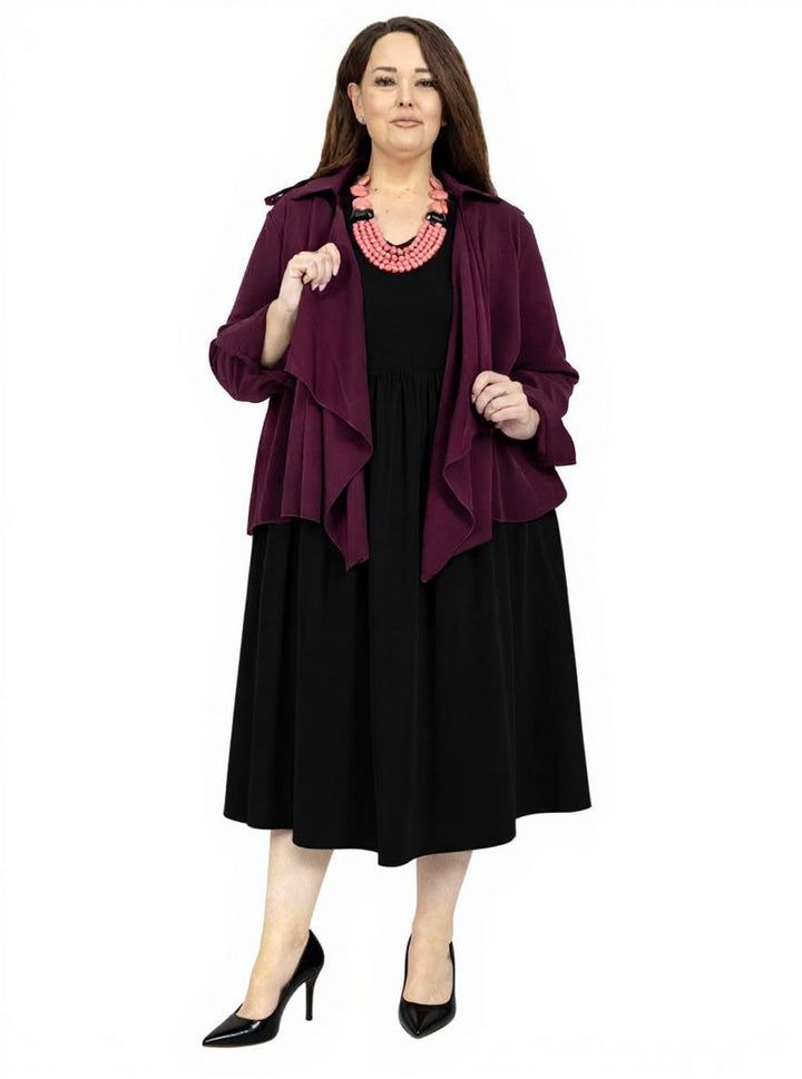 Our popular Waterfall jacket is back in a stunning maroon. With long sleeves and a soft, flowing waterfall look, this smart cropped jacket will skim and flatter your curves. Team it with matching Maroon Harvey pants or layer it over a long top or blouse for a beautiful, layered look.