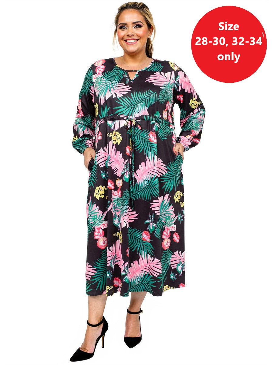 This gorgeous plus-size printed keyhole dress is designed to flatter every body shape. Featuring long sleeves with elastic cuffs and convenient side pockets, it offers both style and practicality.