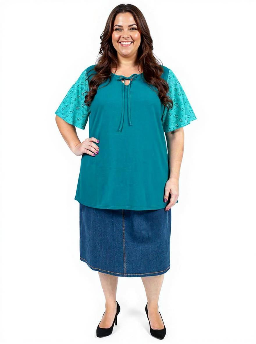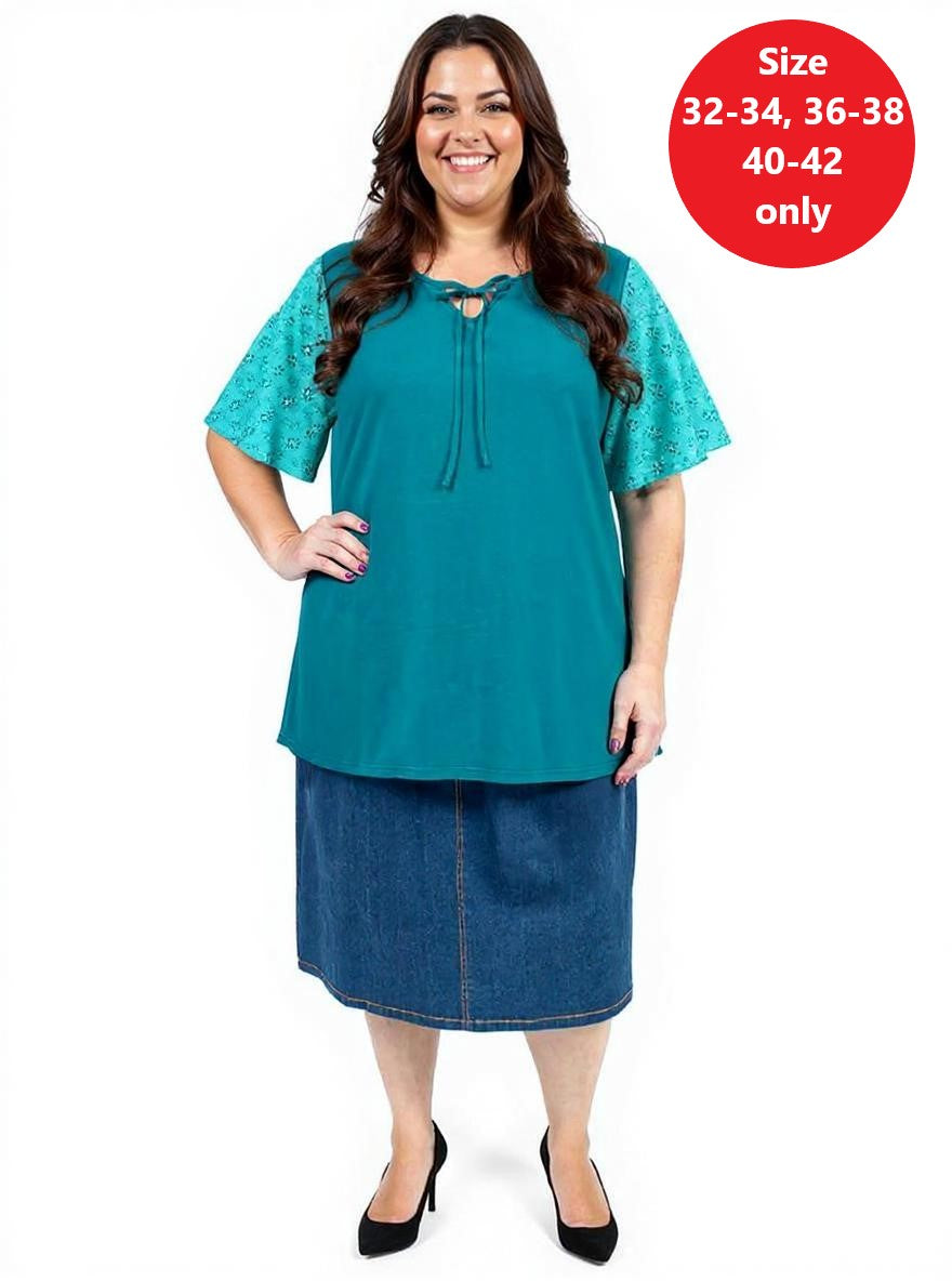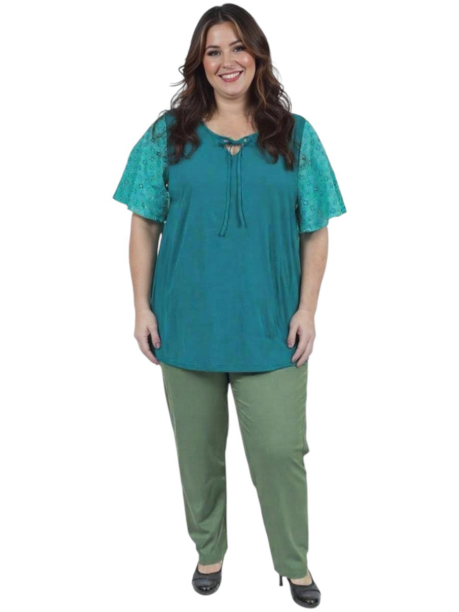 A cool look for summer, this lovely, plus-size cotton top is lightweight, breathable and easy to wear. With round neck it features tie at the neck with elbow-length flutter sleeves in a beautiful matching cotton Anglaise. Available in Emerald and Pink for a soft, casual look