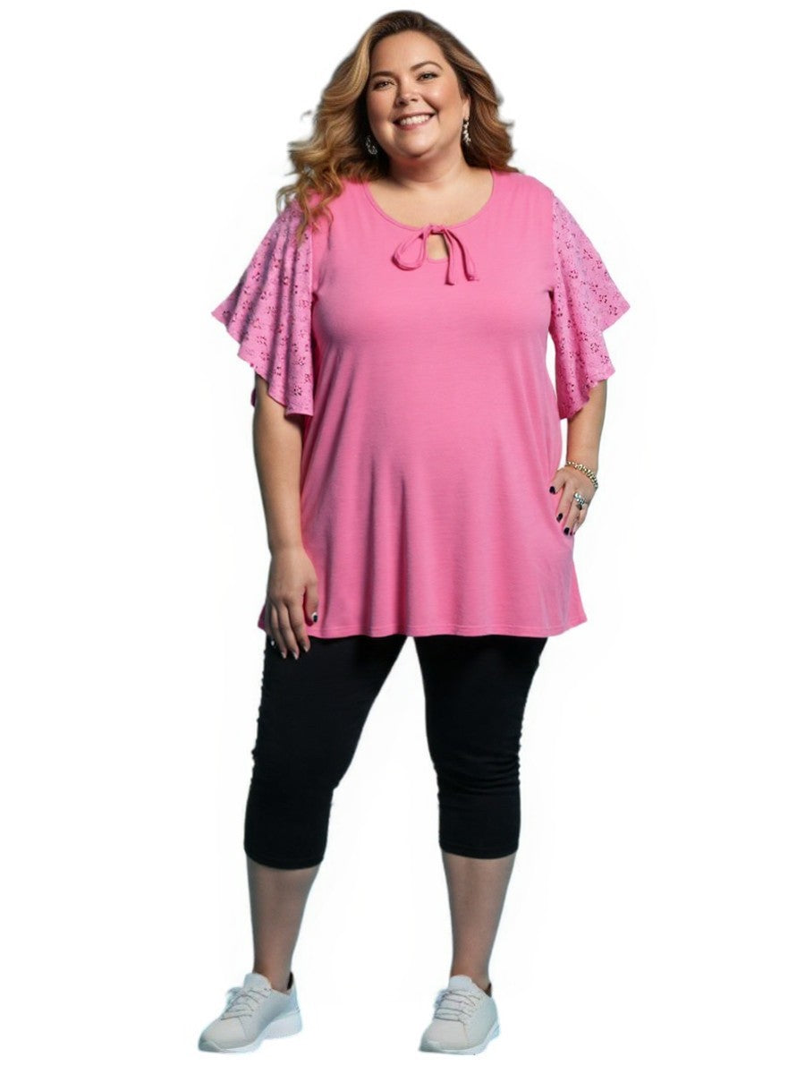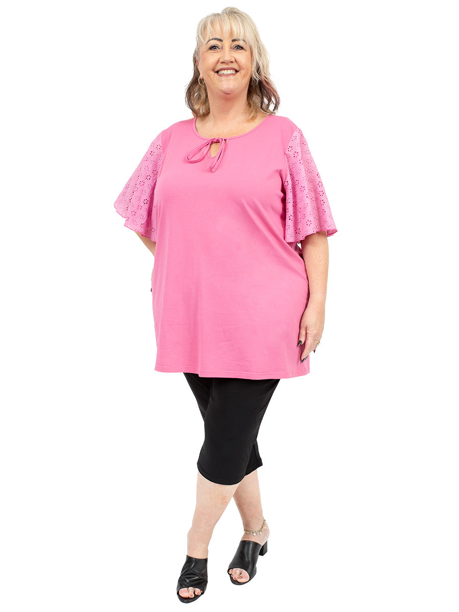 A cool look for summer, this lovely, plus-size cotton top is lightweight, breathable and easy to wear. With round neck it features tie at the neck with elbow-length flutter sleeves in a beautiful matching cotton Anglaise. Available in Emerald and Pink for a soft, casual look