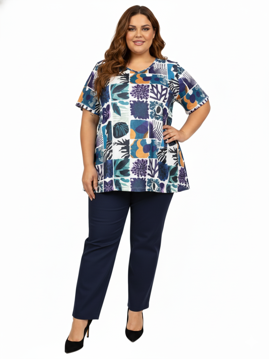 A fresh look for autumn, this stylish women’s, plus size printed top is versatile and easy care, with short sleeves and v-neck, in a pretty blue and white print poly-spandex, with swing though the hem for a comfortable fit. Also available in Teal Print and Royal Blue.